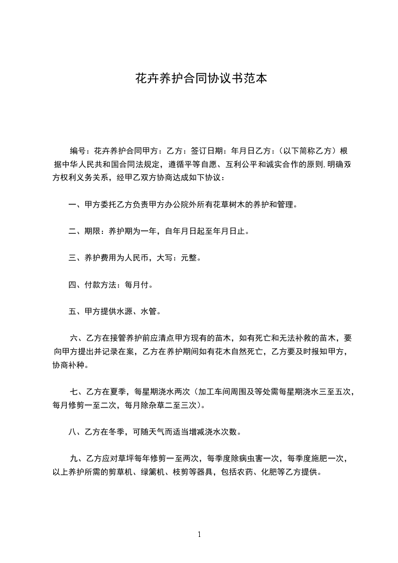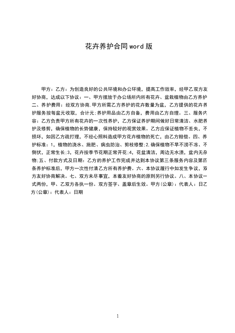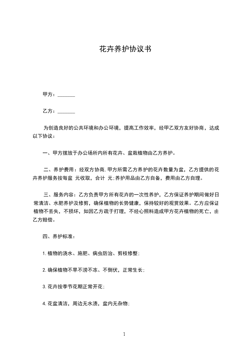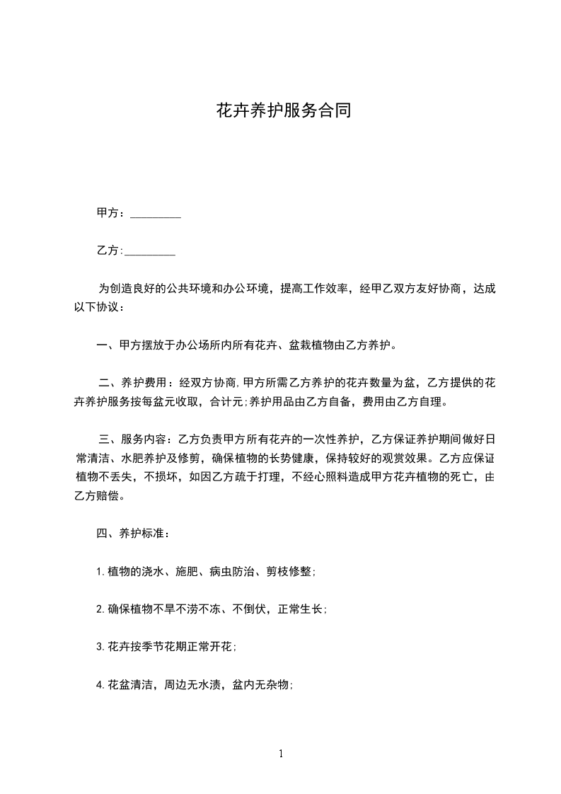 二、养护费用:经双方协商,甲方所需乙方养护的花卉数量为盆,乙方提供的花卉养护服务按每盆元收取,合计元;养护用品由乙方自备,费用由乙方自理。