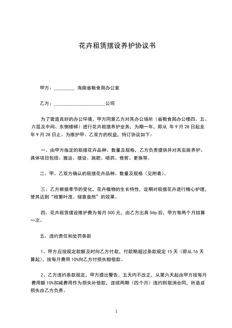 三、服务内容:乙方负责甲方所有花卉的一次性养护,乙方保证养护期间做好日常清洁、水肥养护及修剪,确保植物的长势健康,保持较好的观赏效果。乙方应保证植物不丢失,不损坏,如因乙方疏打理,不经心照料造成甲方花卉植物的死亡,由乙方赔偿。