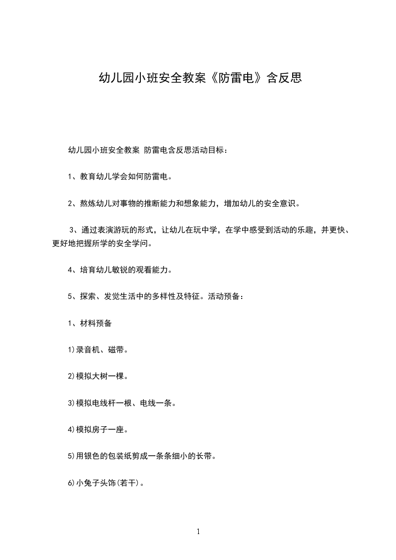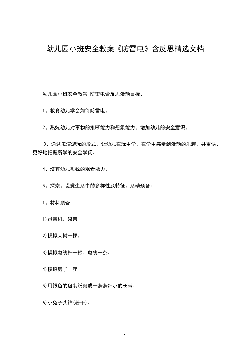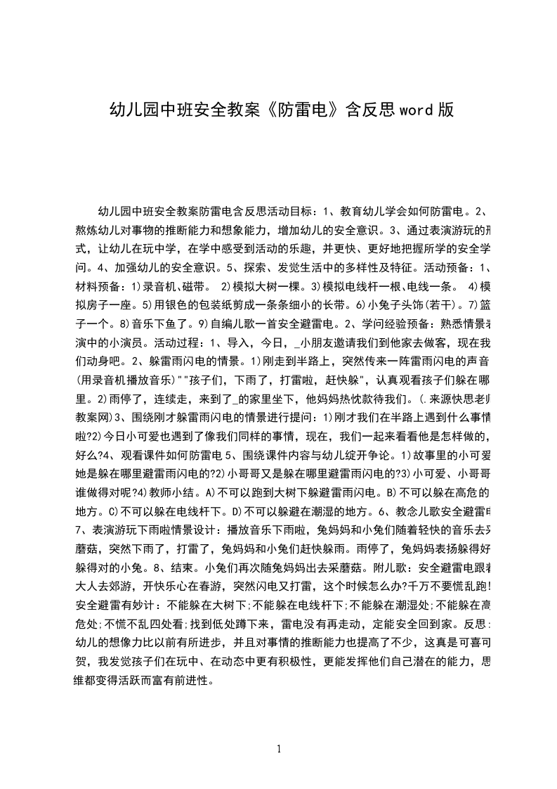 8、结束。小兔们再次随兔妈妈出去采蘑菇。附儿歌:安全避雷电跟着大人去郊游,开快乐心在春游,突然闪电又打雷,这个时候怎么办?千万不要慌乱跑!安全避雷有妙计:不能躲在大树下;不能躲在电线杆下;不能躲在潮湿处;不能躲在高危处;不慌不乱四处看;找到低处蹲下来,雷电没有再走动,定能安全回到家。反思:幼儿的想像力比以前有所进步,并且对事情的推断能力也提高了不少,这真是可喜可贺,我发觉孩子们在玩中、在动态中更有积极性,更能发挥他们自己潜在的能力,思维都变得活跃而富有前进性。