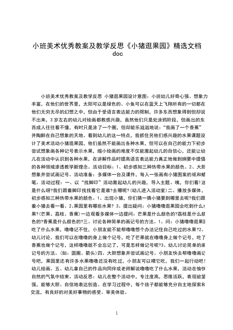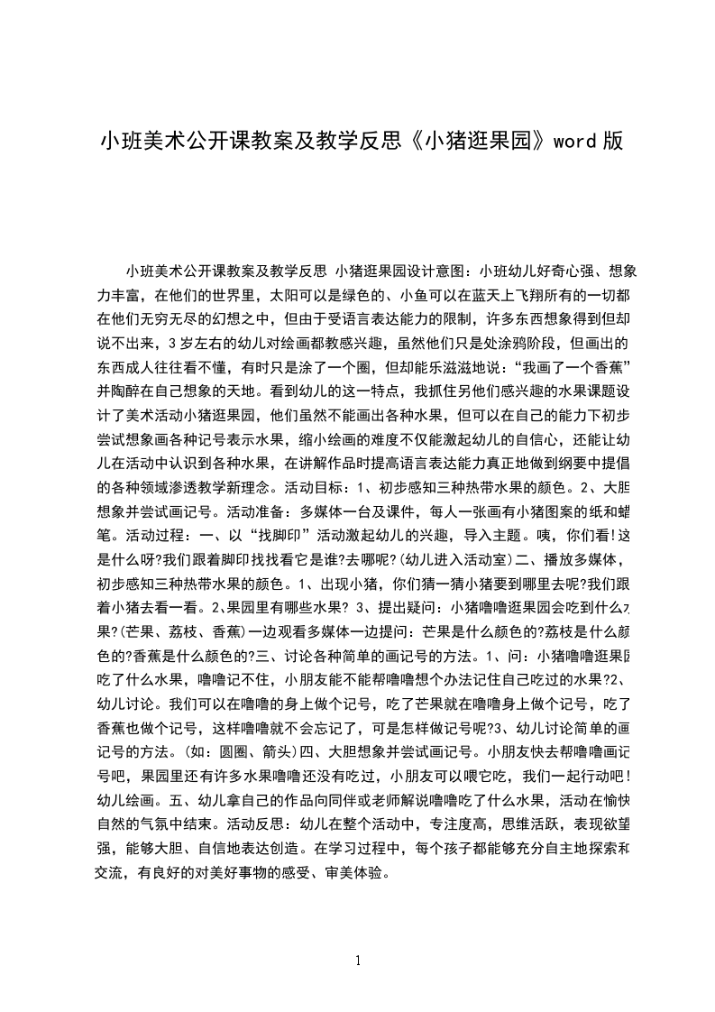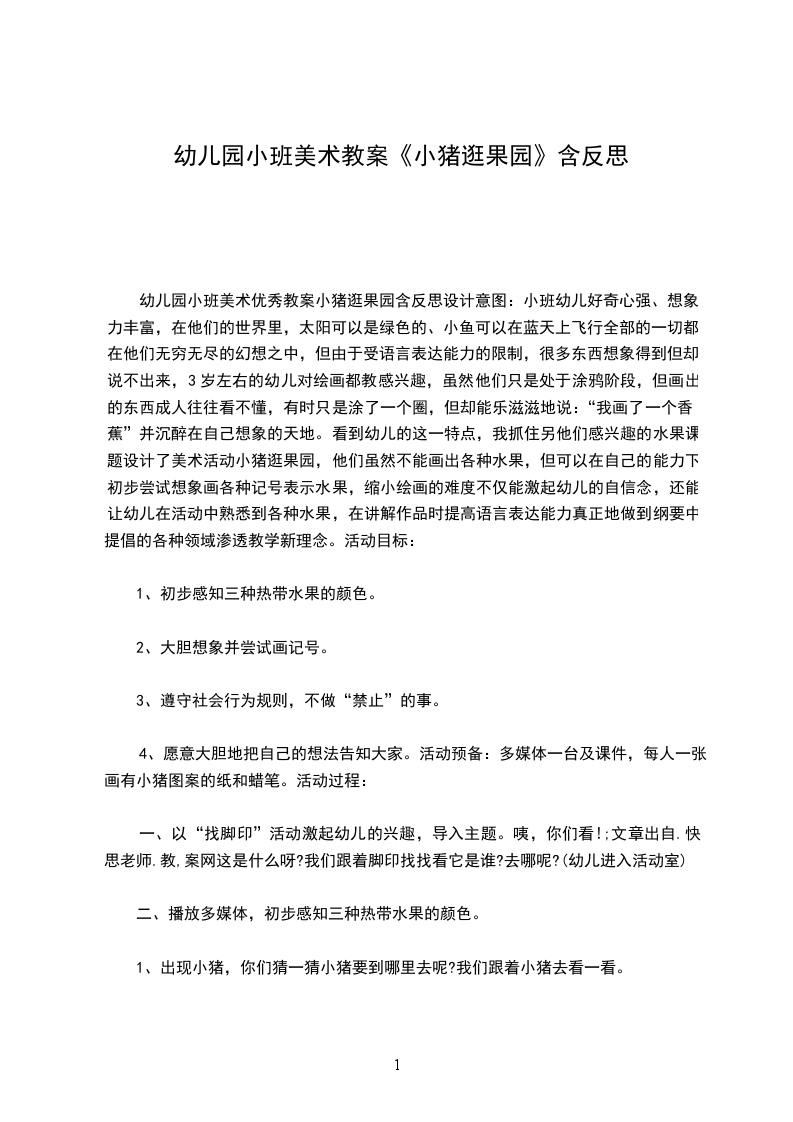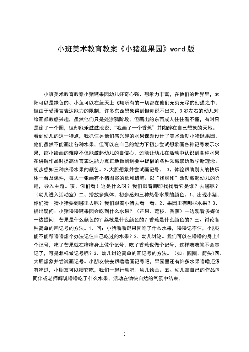 小班美术教育教案小猪逛果园幼儿好奇心强、想象力丰富,在他们的世界里,太阳可以是绿色的、小鱼可以在蓝天上飞翔所有的一切都在他们无穷无尽的幻想之中,但由于受语言表达能力的限制,许多东西想象得到但却说不出来,3岁左右的幼儿对绘画都教感兴趣,虽然他们只是处涂鸦阶段,但画出的东西成人往往看不懂,有时只是涂了一个圈,但却能乐滋滋地说:“我画了一个香蕉”并陶醉在自己想象的天地。看到幼儿的这一特点,我抓住另他们感兴趣的水果课题设计了美术活动小猪逛果园,他们虽然不能画出各种水果,但可以在自己的能力下初步尝试想象画各种记号表示水果,缩小绘画的难度不仅能激起幼儿的自信心,还能让幼儿在活动中认识到各种水果,在讲解作品时提高语言表达能力真正地做到纲要中提倡的各种领域渗透教学新理念。初步感知三种热带水果的颜色。