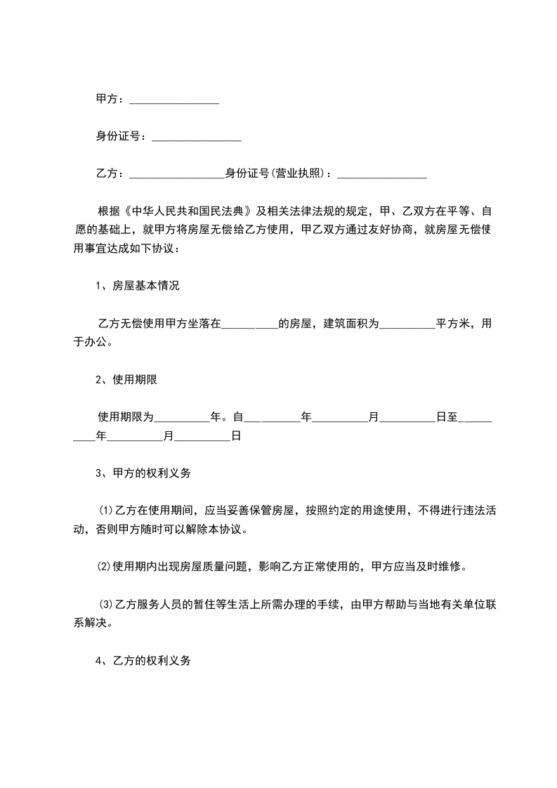 乙方无偿使用甲方坐落在__________的房屋,建筑面积为__________平方米,用于办公。