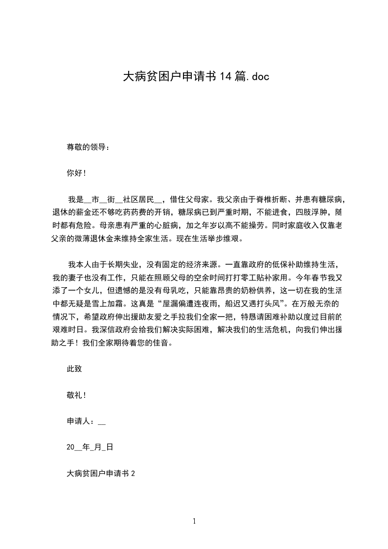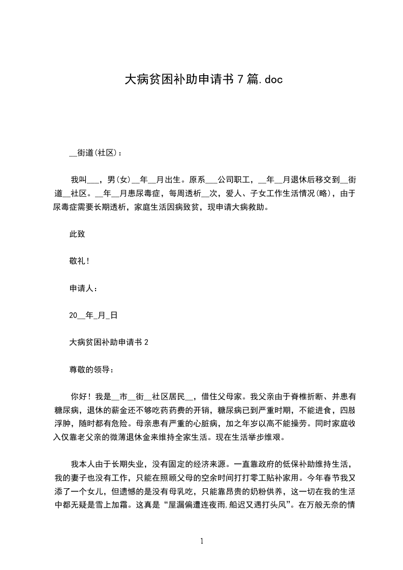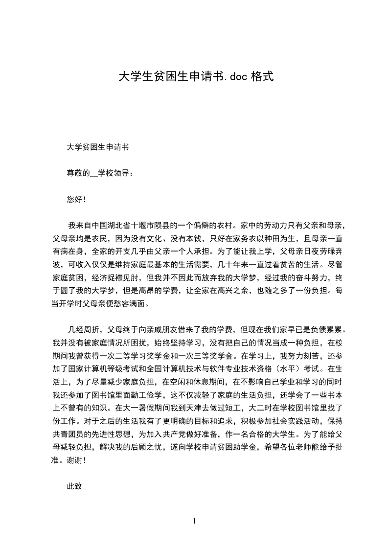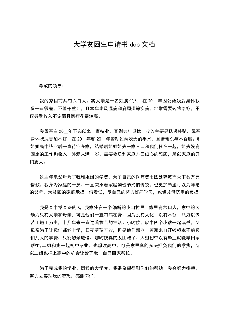 你们好!我是来自四川省__市__县__镇__村_组的贫困学生__,20__年__月__日出生于__村__社。家有6口人,爷爷奶奶,爸妈,哥哥和我。爷爷奶奶年过八十,身子虚弱,长期卧病在床,需要人照料;爸爸妈妈长期在__镇__村四组务农,凭此微薄收入维持家庭日用;哥哥也不得不因此辍学,外出务工,以求补贴家用但现下,我的继续求学为家庭带来了新的经济负担,高额的学费和生活费无从着落,因此特向你们申请贫困扶助!