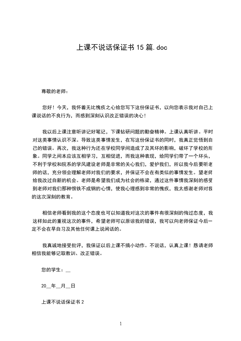 今天,我怀着愧疚和懊悔给您写下这份保证书,以向您表示我对上课讲话这种不良行为的深刻认识以及再也不在上课的时候讲闲话的决心。