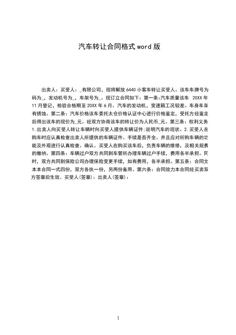 出卖人:买受人:_有限公司,现将解放6440小客车转让买受人。该车车牌号为码为_,发动机号为_,车架号为_。现订立合同如下: