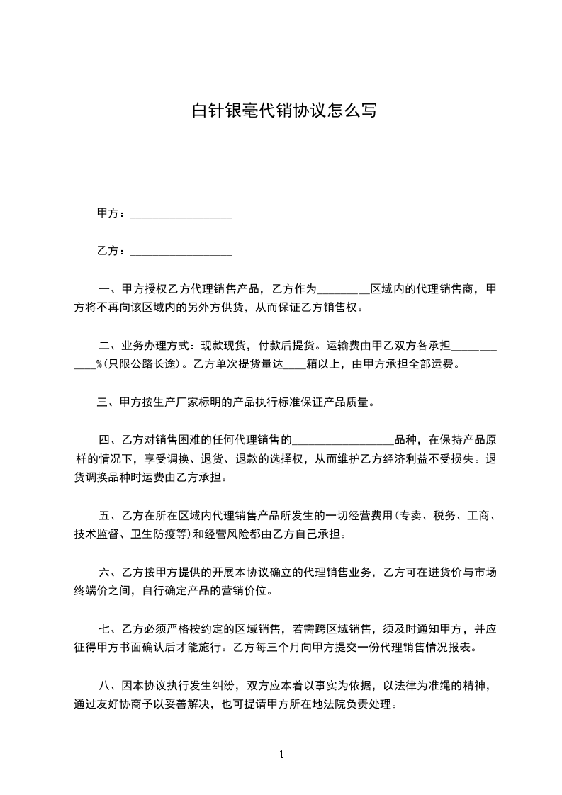 一、甲方授权乙方代理销售____________________________产品,乙方作为_________区域内的代理销售商,甲方将不再向该区域内的另外方供货,从而保证乙方独家销售权。