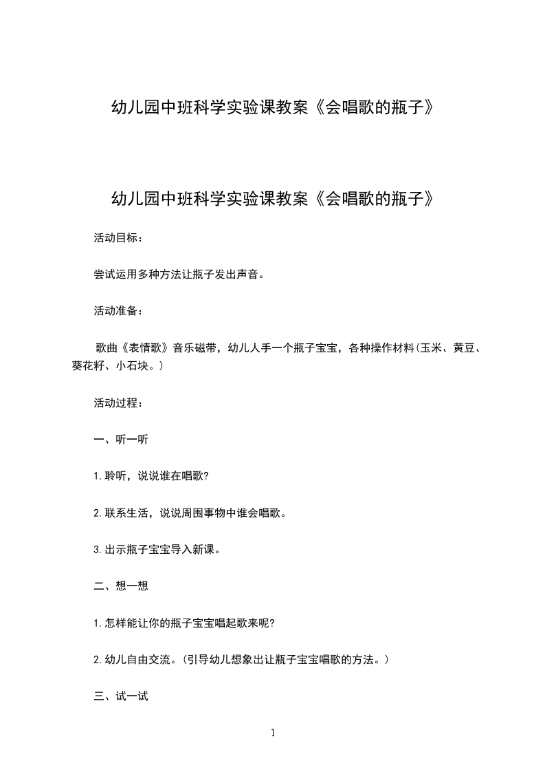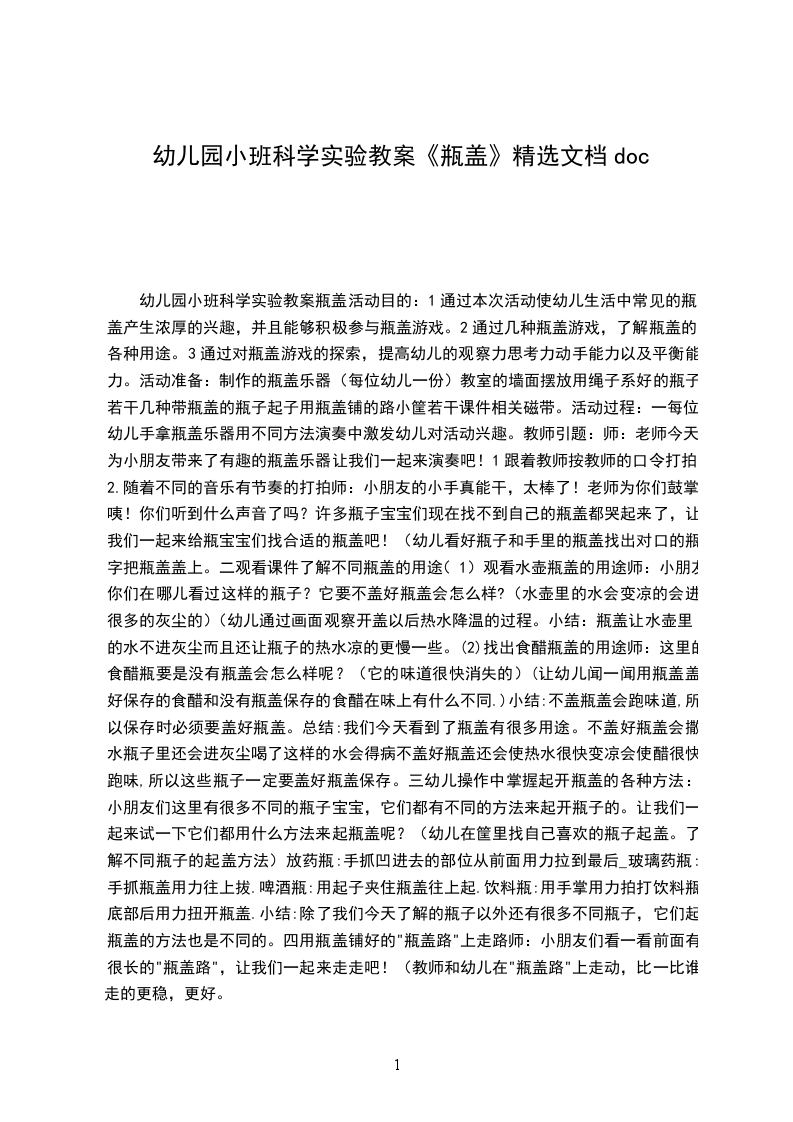 幼儿园小班科学实验教案瓶盖活动目的:1通过本次活动使幼儿生活中常见的瓶盖产生浓厚的兴趣,并且能够积极参与瓶盖游戏。2通过几种瓶盖游戏,了解瓶盖的各种用途。3通过对瓶盖游戏的探索,提高幼儿的观察力思考力动手能力以及平衡能力。活动准备:制作的瓶盖乐器(每位幼儿一份)教室的墙面摆放用绳子系好的瓶子若干几种带瓶盖的瓶子起子用瓶盖铺的路小筐若干课件相关磁带。