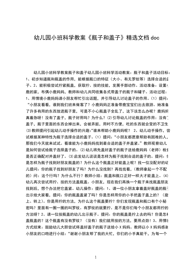 (2)找出食醋瓶盖的用途师:这里的食醋瓶要是没有瓶盖会怎么样呢?(它的味道很快消失的)(让幼儿闻一闻用瓶盖盖好保存的食醋和没有瓶盖保存的食醋在味上有什么不同.)小结:不盖瓶盖会跑味道,所以保存时必须要盖好瓶盖。总结:我们今天看到了瓶盖有很多用途。不盖好瓶盖会撒水瓶子里还会进灰尘喝了这样的水会得病不盖好瓶盖还会使热水很快变凉会使醋很快跑味,所以这些瓶子一定要盖好瓶盖保存。三幼儿操作中掌握起开瓶盖的各种方法:小朋友们这里有很多不同的瓶子宝宝,它们都有不同的方法来起开瓶子的。让我们一起来试一下它们都用什么方法来起瓶盖呢?(幼儿在筐里找自己喜欢的瓶子起盖。了解不同瓶子的起盖方法)放药瓶:手抓凹进去的部位从前面用力拉到最后_玻璃药瓶:手抓瓶盖用力往上拔.啤酒瓶:用起子夹住瓶盖往上起.饮料瓶:用手掌用力拍打饮料瓶底部后用力扭开瓶盖.小结:除了我们今天了解的瓶子以外还有很多不同瓶子,它们起瓶盖的方法也是不同的。四用瓶盖铺好的"瓶盖路"上走路师:小朋友们看一看前面有很长的"瓶盖路",让我们一起来走走吧!(教师和幼儿在"瓶盖路"上走动,比一比谁走的更稳,更好。