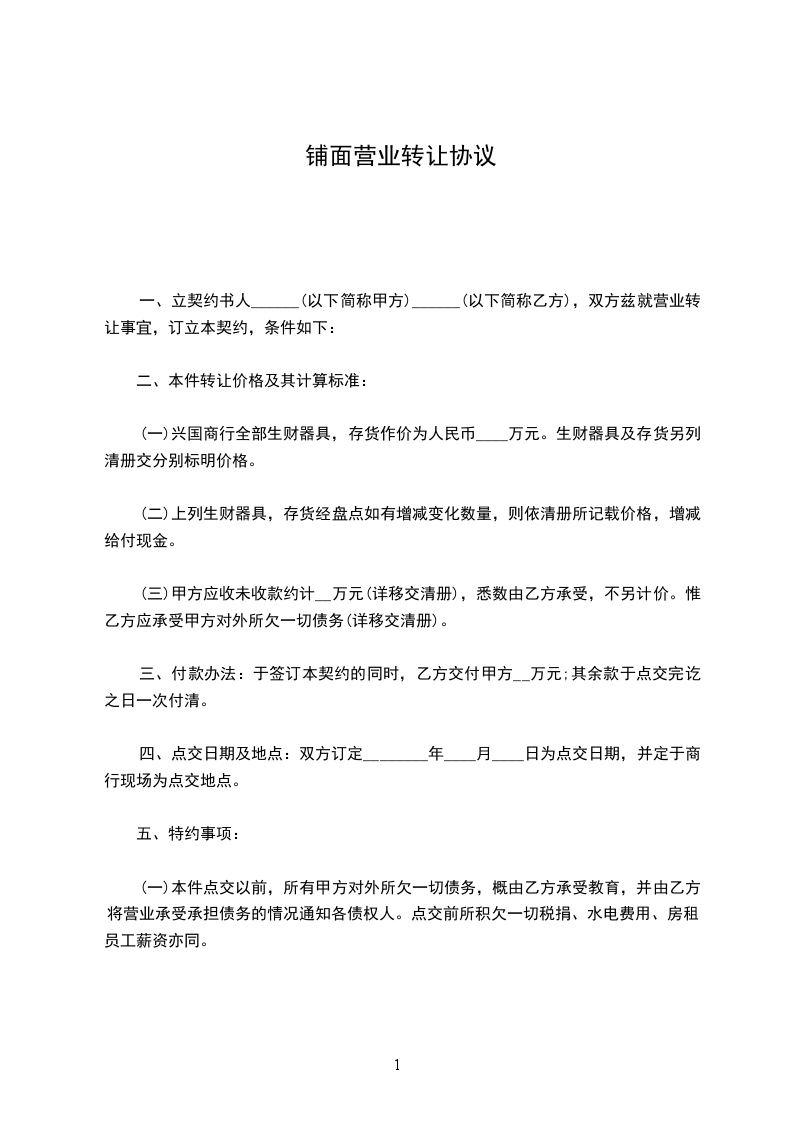 立契约书人______(以下简称甲方)______(以下简称乙方),双方兹就营业转让事宜,订立本契约,条件如下: