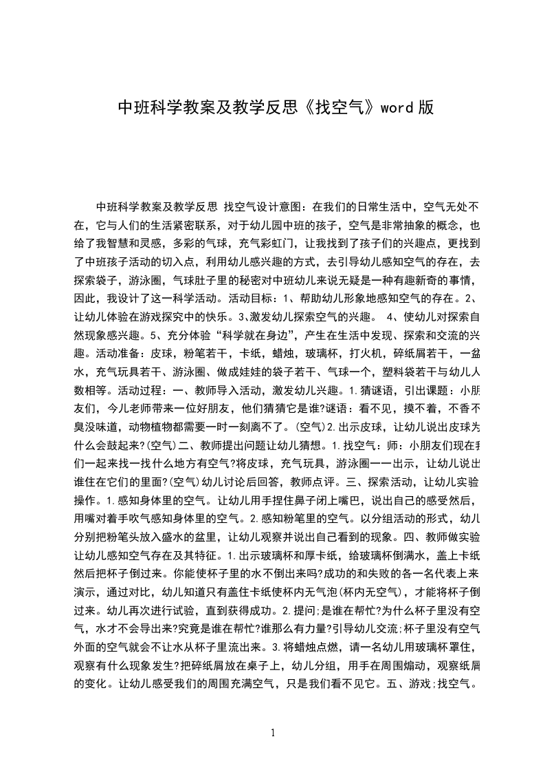 五、游戏;找空气。让幼儿一人一个塑料袋到外面找空气玩,活动结束。活动反思:本活动是让幼儿对实验中发生的现象产生兴趣,通过在实验中让幼儿操作并在探索的基础上让幼儿获得经验,玻璃杯中没有空气,外面的空气就会进来,把水倒入杯中用卡纸盖住,卡纸就会被吸住,水不会倒出来,添加了用杯子去盖住点燃的蜡烛,一下蜡烛就灭了。说明空气可以支持燃烧,这样吸引了幼儿的注意,目的是通过丰富多彩的活动,为幼儿建立了一个探索,尝试与交流的平台。在活动中利用了启发提问观察的方法引导幼儿进行实践操作。幼儿通过猜谜语一一寻找空气一一试验操作的教学环节,让抽象的自然想象变得具体化,整个活动的气氛很活跃,突出了活动的重难点,丰富了幼儿的生活经验,让幼儿理解了生活离不开空气,空气无处不在,培了幼儿的认知能力。