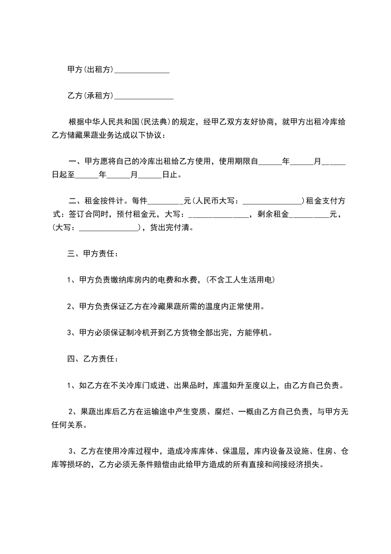 根据中华人民共和国(民法典)的规定,经甲乙双方友好协商,就甲方出租冷库给乙方储藏果蔬业务达成以下协议: