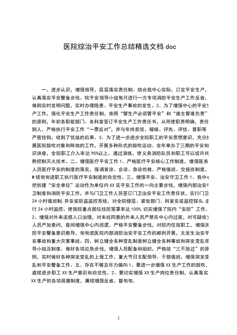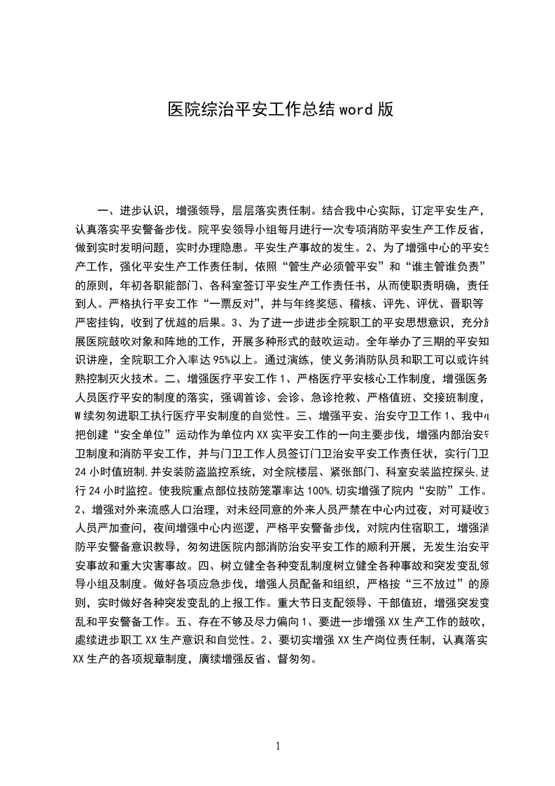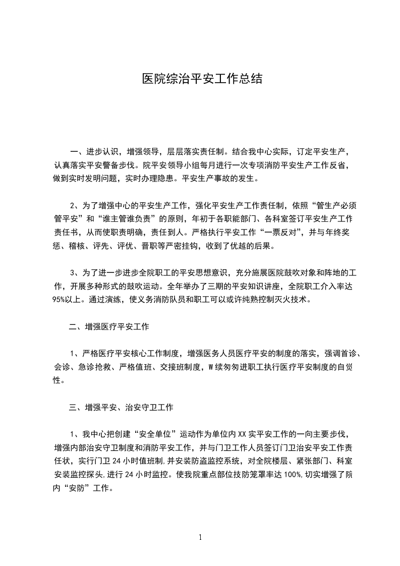 1、我中心把创建“安全单位”运动作为单位内XX实平安工作的一向主要步伐,增强内部治安守卫制度和消防平安工作,并与门卫工作人员签订门卫治安平安工作责任状,实行门卫24小时值班制,并安装防盗监控系统,对全院楼层、紧张部门、科室安装监控探头,进行24小时监控。使我院重点部位技防笼罩率达100%,切实增强了院内“安防”工作。