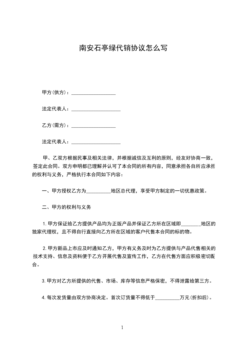 一、甲方授权乙方为__________地区总代理,享受甲方制定的一切优惠政策。