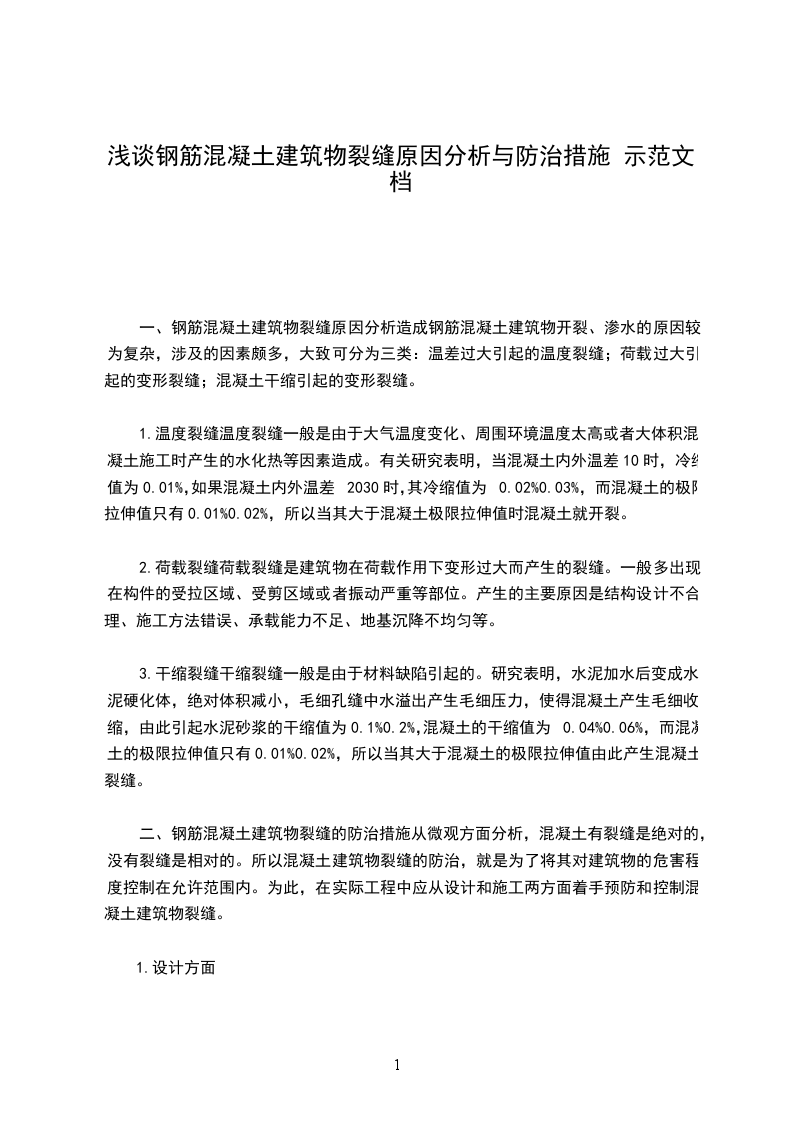 二、钢筋混凝土建筑物裂缝的防治措施从微观方面分析,混凝土有裂缝是绝对的,没有裂缝是相对的。所以混凝土建筑物裂缝的防治,就是为了将其对建筑物的危害程度控制在允许范围内。为此,在实际工程中应从设计和施工两方面着手预防和控制混凝土建筑物裂缝。
