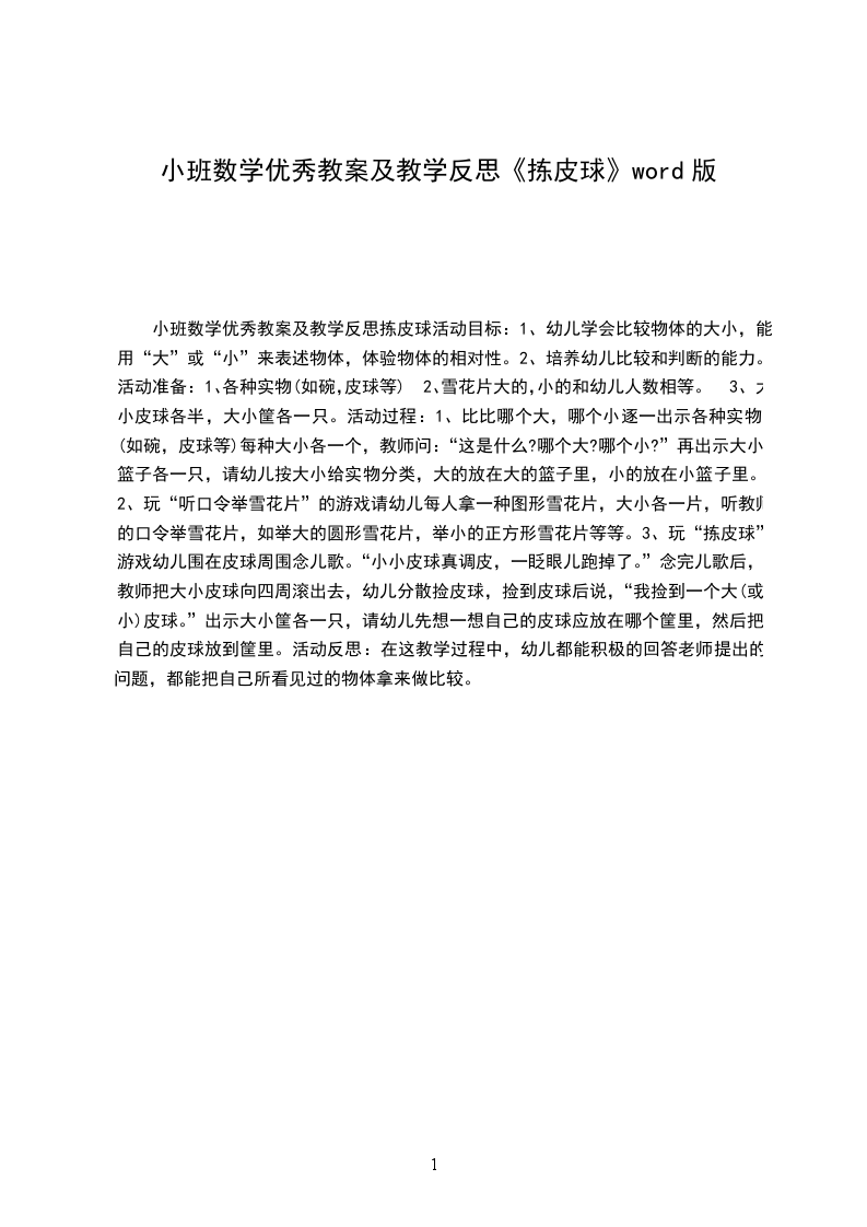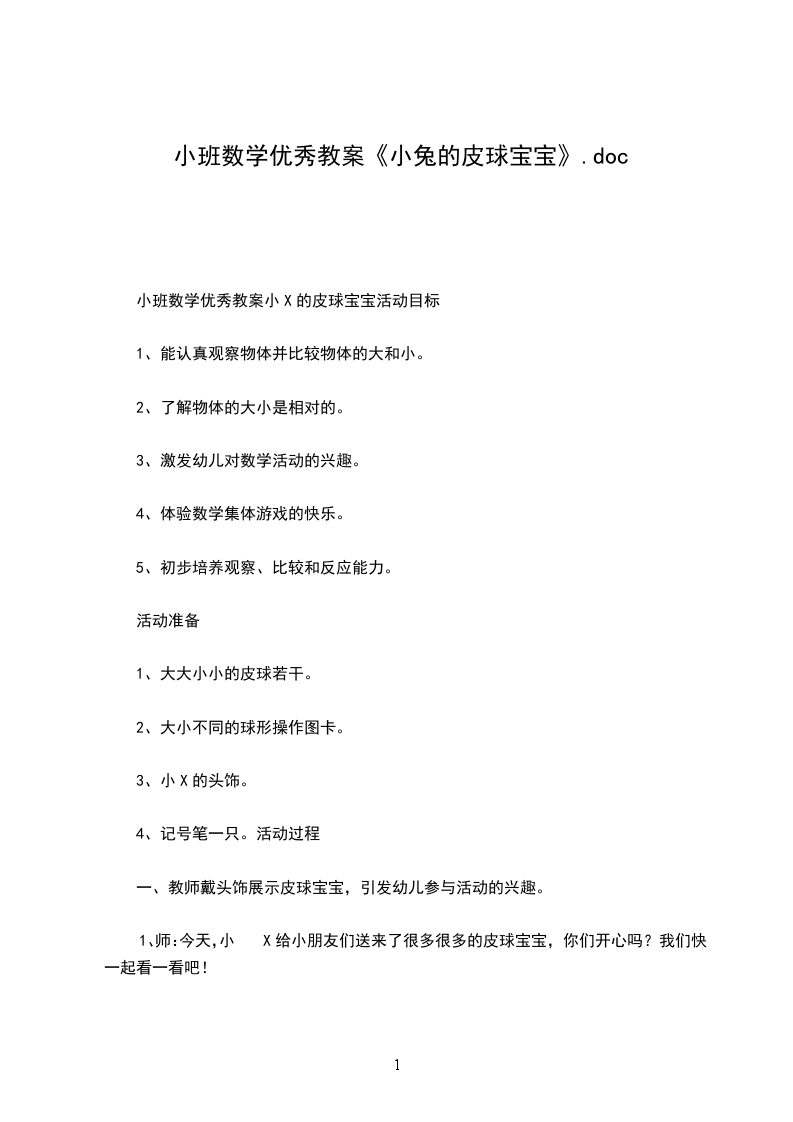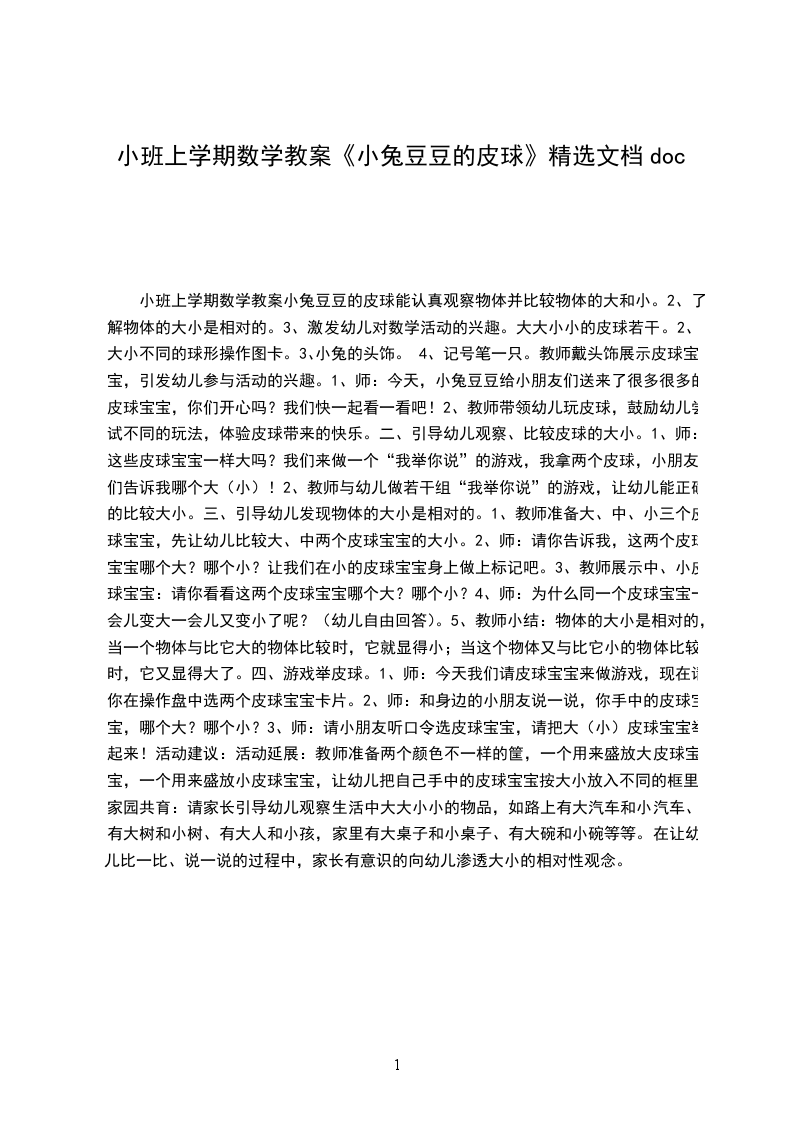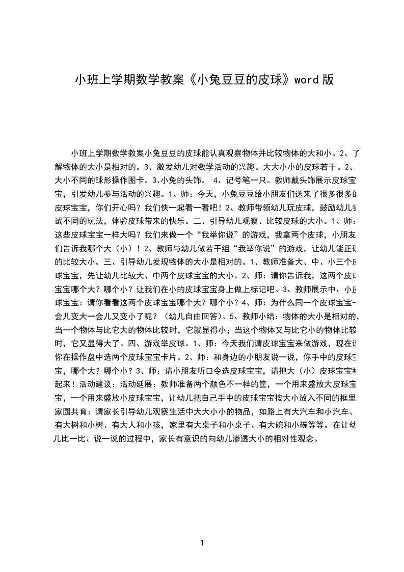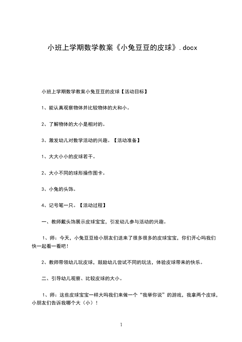小班上学期数学教案拣皮球幼儿园小班数学教案:拣皮球拣皮球(比较大小)活动目标:幼儿学会比较物体的大小,能用“大”或“小”来表述物体,体验物体的相对性。活动准备: