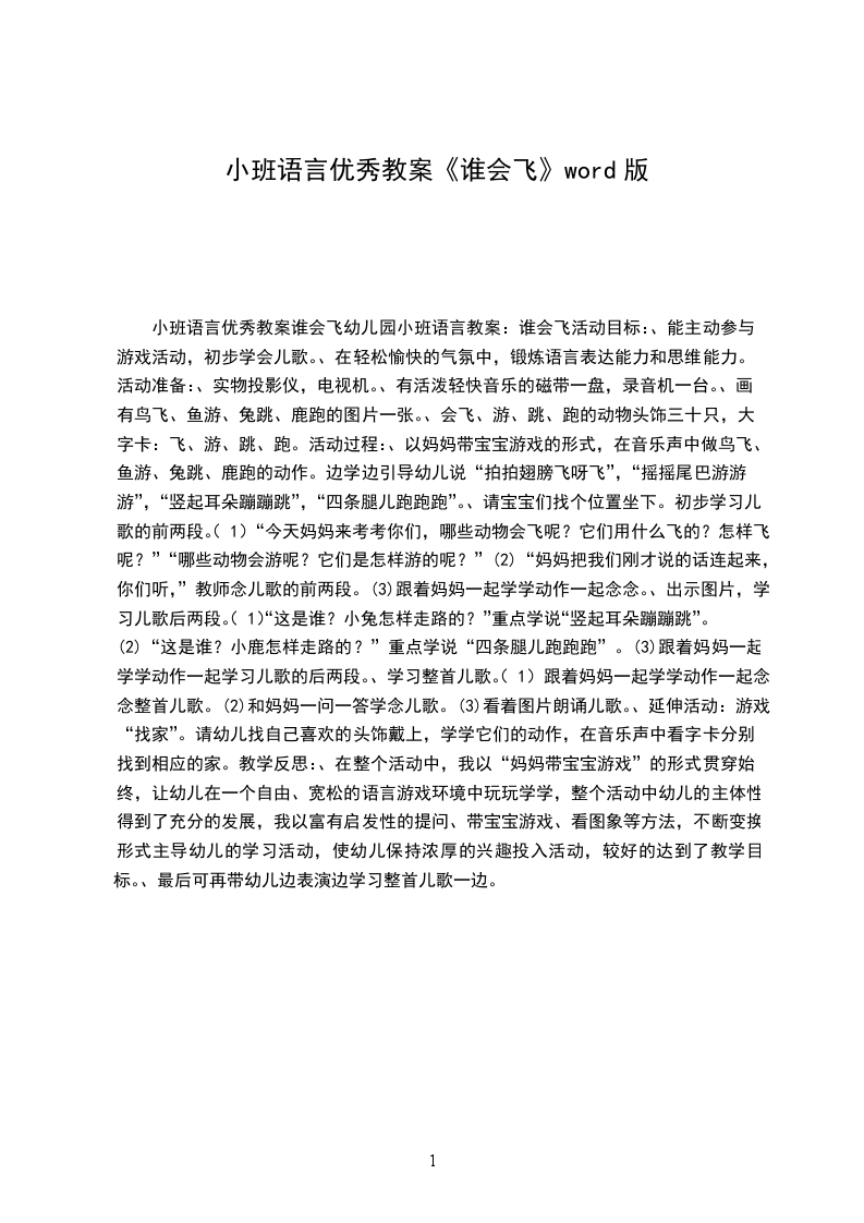 小班语言优秀教案谁会飞幼儿园小班语言教案:谁会飞活动目标:、能主动参与游戏活动,初步学会儿歌。、在轻松愉快的气氛中,锻炼语言表达能力和思维能力。活动准备:、实物投影仪,电视机。、有活泼轻快音乐的磁带一盘,录音机一台。、画有鸟飞、鱼游、兔跳、鹿跑的图片一张。、会飞、游、跳、跑的动物头饰三十只,大字卡:飞、游、跳、跑。