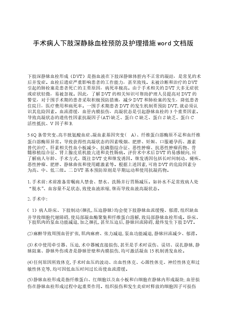 5.6Q条带突变、高半胱氨酸血症、凝血素基因突变(A)、纤维蛋白溶酶原不足和血纤维蛋白溶酶原异常。导致获得性高凝状态的因素吸烟、肥胖、妊娠、口服避孕药、激素替代治疗、肝素相关性血小板减少、抗磷脂综合征、恶性肿瘤、抗恶性肿瘤药物、骨髓移植综合征、肾上腺皮质机能亢进和炎性肠病。评价术中术后DVT的易感倾向,应了解病人年龄、手术方式、既往DVT史和继发诱因。继发诱因包括长时间制动、瘫痪、恶性肿瘤、肥胖、静脉曲张和使用雌激素等。根据上述因素,可将DVT的危险因素分为高、中、低三级。二DVT基本预防原则是早期运动和使用抗凝药物。