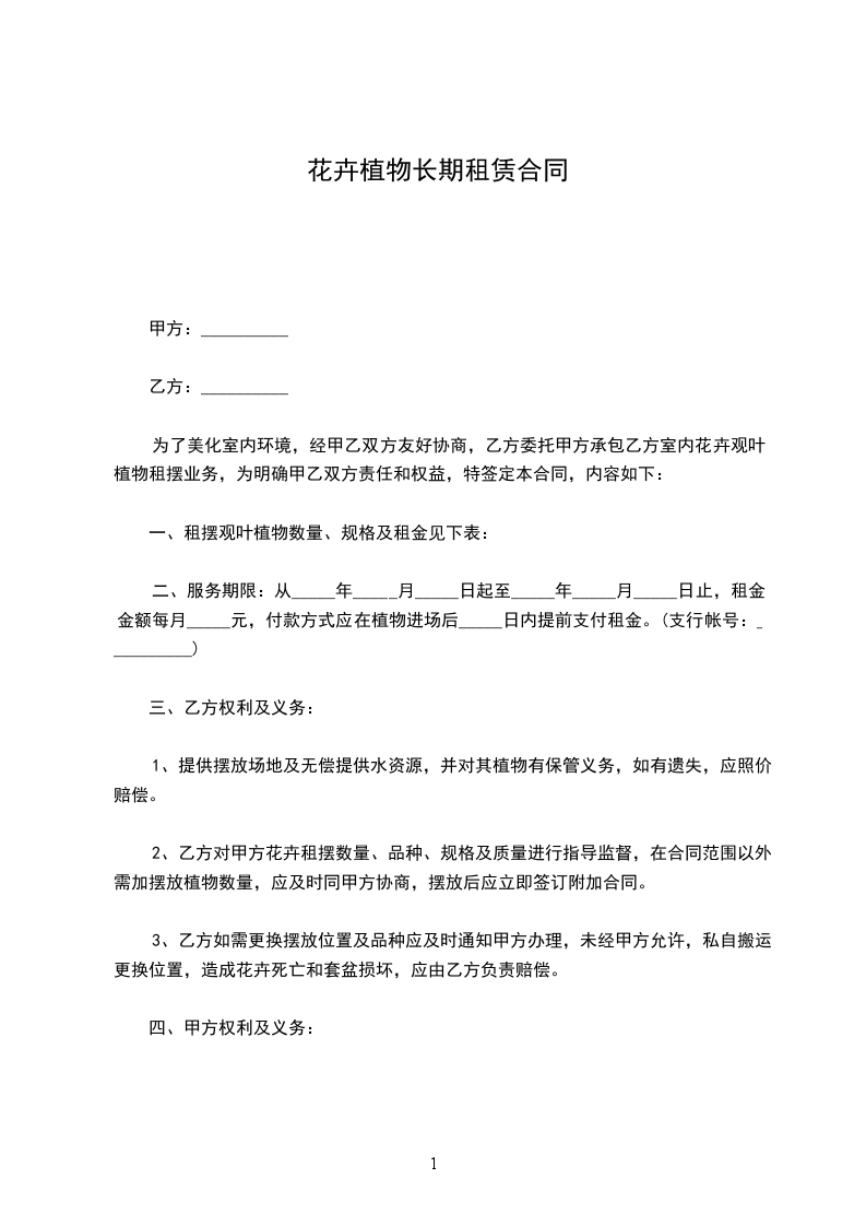本合同自________年________月________日至________年________月________日,合同期限________年。花卉合同到期后自动顺延一年,如需解除,提前30天书面通知对方。