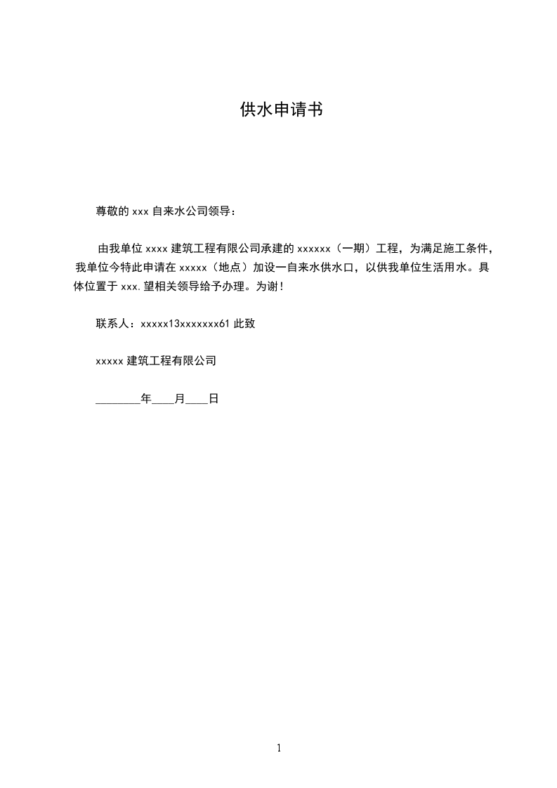 由我单位xxxx建筑工程有限公司承建的xxxxxx(一期)工程,为满足施工条件,我单位今特此申请在xxxxx(地点)加设一自来水供水口,以供我单位生活用水。具体位置于xxx.望相关领导给予办理。为谢!