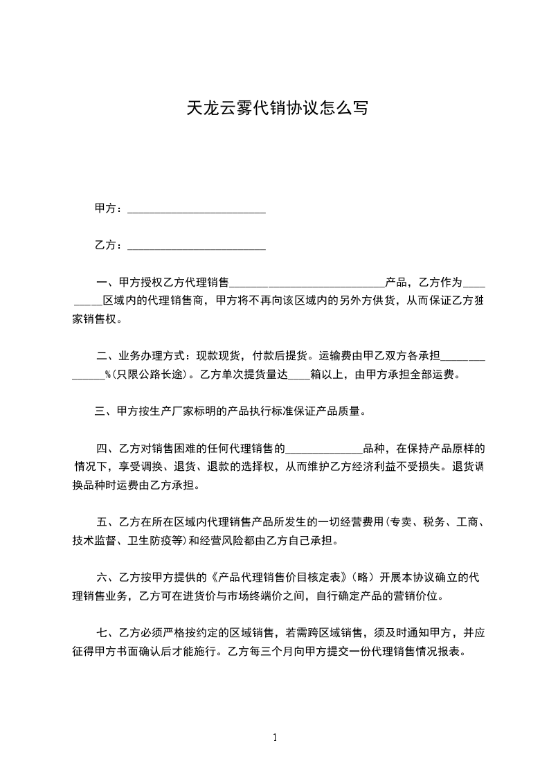 一、甲方授权乙方代理销售____________________________产品,乙方作为_________区域内的代理销售商,甲方将不再向该区域内的另外方供货,从而保证乙方独家销售权。