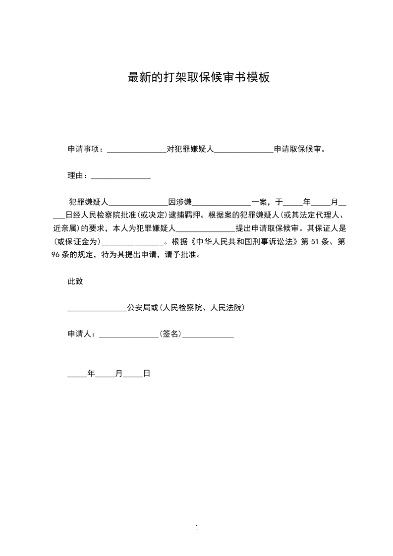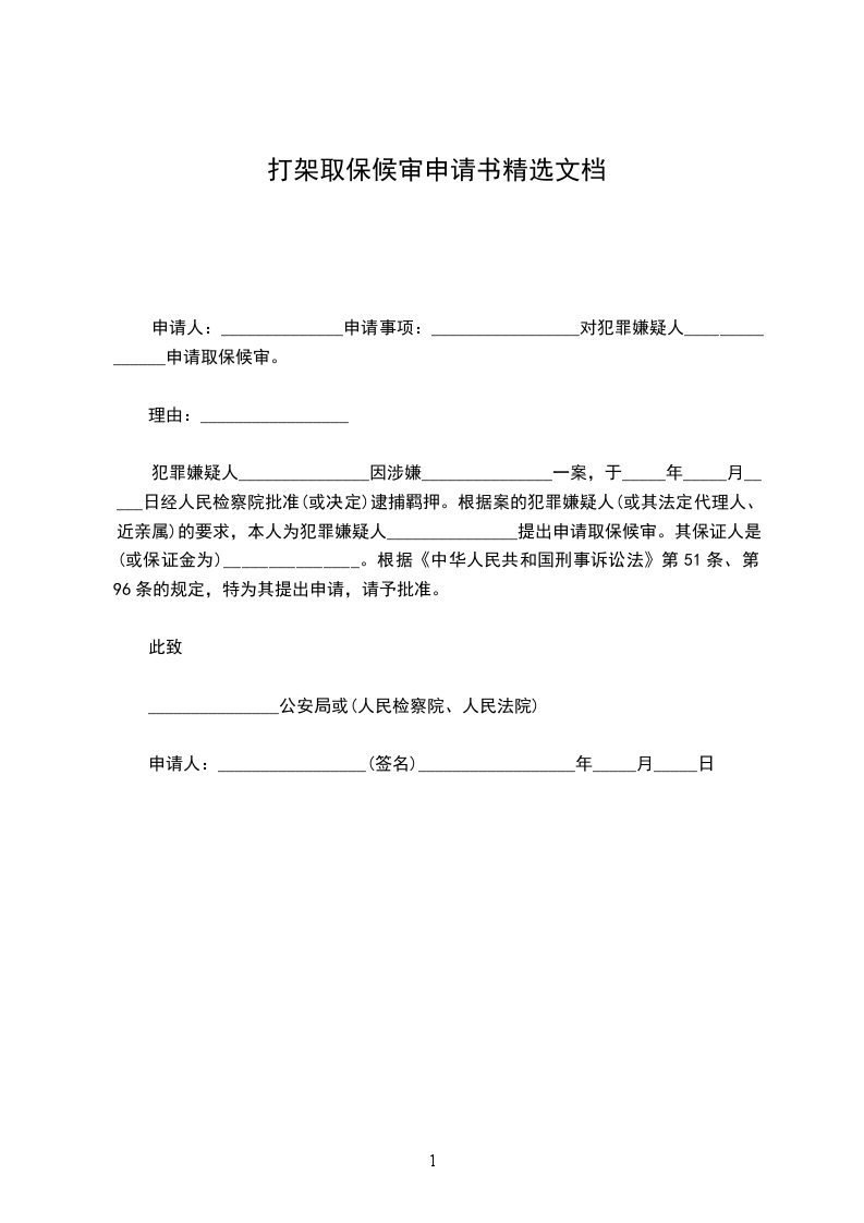 犯罪嫌疑人_______________因涉嫌_______________一案,于_____年_____月_____日经人民检察院批准(或决定)逮捕羁押。根据案的犯罪嫌疑人(或其法定代理人、近亲属)的要求,本人为犯罪嫌疑人_______________提出申请取保候审。其保证人是(或保证金为)_______________。根据《中华人民共和国刑事诉讼法》第51条、第96条的规定,特为其提出申请,请予批准。