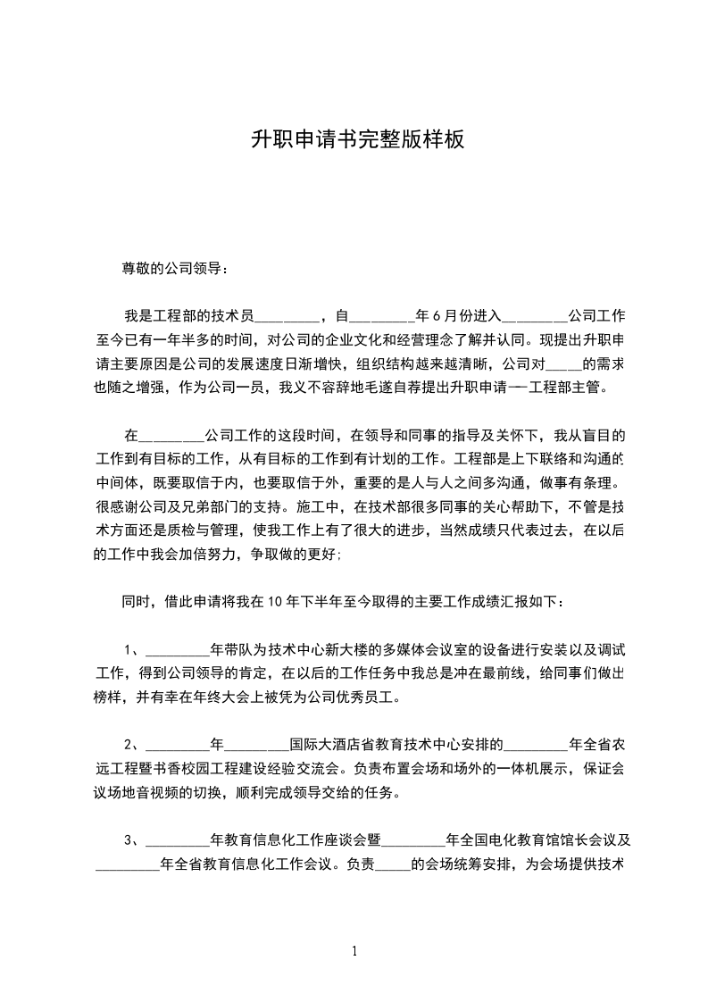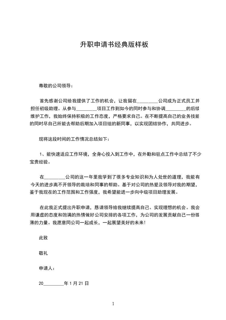 首先感谢公司给我提供了工作的机会,让我留在__公司成为正式员工并担任初级助理。从参与___项目工作到如今的同时参与和协调___的后续维护工作,我始终保持积极的工作态度,严格要求自己。在不断提高自己的业务技能的同时尽自己所能去帮助后期加入项目组的新同事,以实现团结协作,共同进步。现将这段时间的工作情况总结如下:1、能快速适应工作环境,全身心投入到工作中,在外勤和驻点工作中总结了不少宝贵经验。2、软件操作能力提高。通过这段时间的制图,制表工作的积累,我掌握了软件的操作和运用,对于各项办公软件的操作也变得更加娴熟。3、积极参与公司活动,与同事相处融洽。在平常的工作生活当中,常主动与同事沟通交谈,做到快乐工作,快乐生活。在__公司的这一年里我学到了很多专业知识和为人处世的道理,我能有今天的进步离不开领导的栽培和同事的帮助。基于对公司的热爱及领导对我的期望,鉴我现在的工作范围和工作强度,我希望能进一步向中级项目助理发展。在此我正式提出升职申请,恳请领导给我继续提高自己、实现理想的机会。我会用谦虚的态度和饱满的热情做好公司安排的各项工作,为公司的发展贡献自己一份微薄的力量。我愿意同公司一起成长,一起展望美好的未来!致敬礼申请人:___20XX年1月21日篇2公司领导:我是职员_,进入公司工作至今已有一年多时间,对公司的企业文化和经营理念了解并认同。现提出升职申请主要原因是公司的发展速度日渐增快,组织结构越来越清晰,公司对人才的需求也随之增强,作为公司一员,我义不容辞地毛遂自荐提出升职申请。在_集团工作的这段时间,在领导和同事的指导及关怀下,我从盲目的工作到有目标的工作,从有目标的工作到有计划的工作。行政部门是上下联络和沟通的中间体,既要取信内,也要取信外,重要的是人与人之间多沟通,做事有条理。同时,借此申请将我在10年上半年取得的工作成绩汇报如下:1、建立电子文档的人事档案汇总,五大员分类管理工作(现转至人力资源部);与工程部共同办理部分五大员年检工作,服务项目部需求。2、顺利收集建造师注册相关资料报至直管部门审核,完成初始