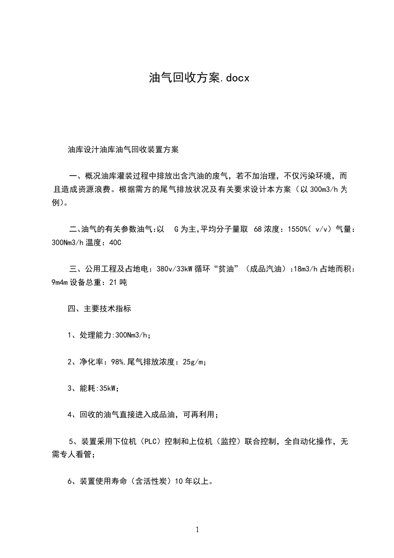 一、概况油库灌装过程中排放出含汽油的废气,若不加治理,不仅污染环境,而且造成资源浪费。根据需方的尾气排放状况及有关要求设计本方案(以300M为例)。