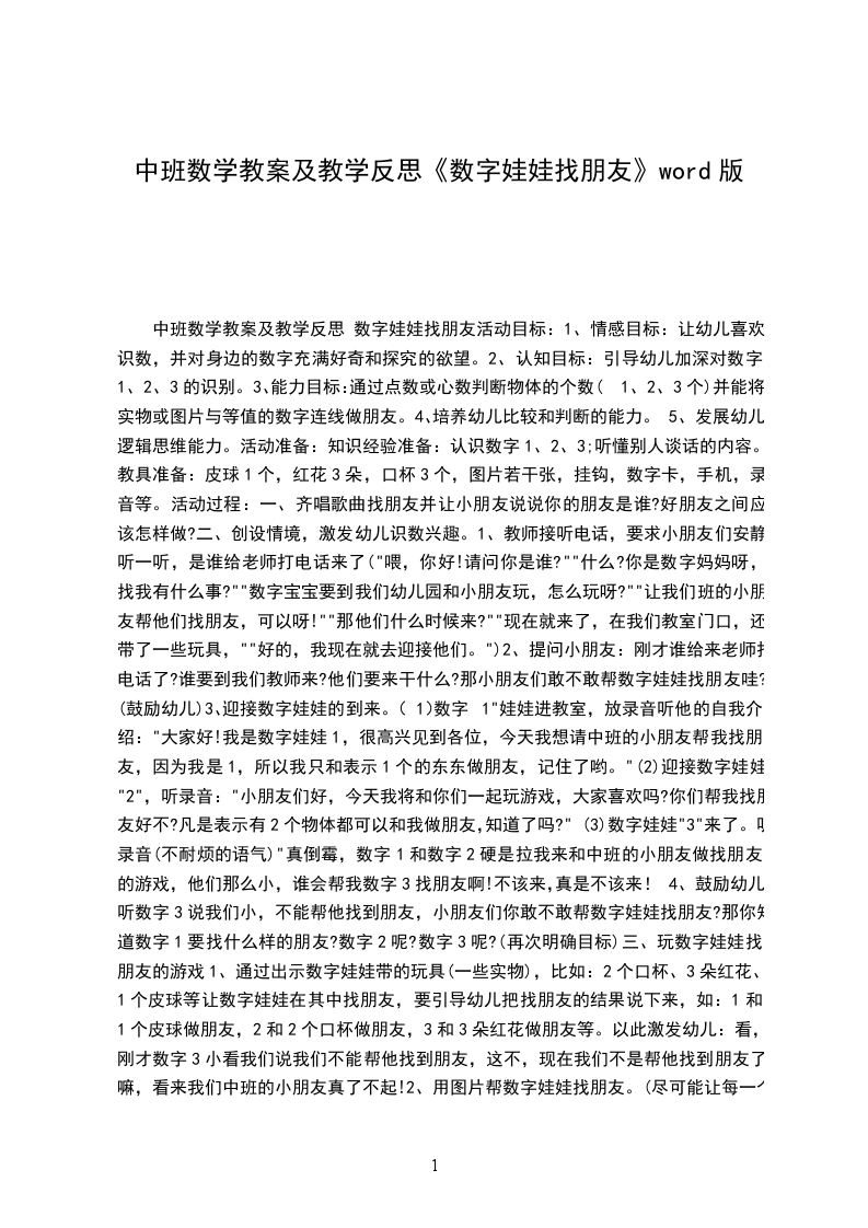 (1)数字1"娃娃进教室,放录音听他的自我介绍:"大家好!我是数字娃娃1,很高兴见到各位,今天我想请中班的小朋友帮我找朋友,因为我是1,所以我只和表示1个的东东做朋友,记住了哟。"