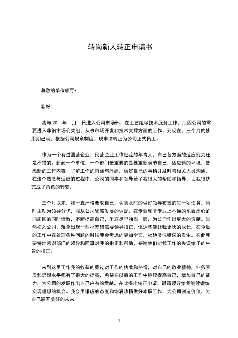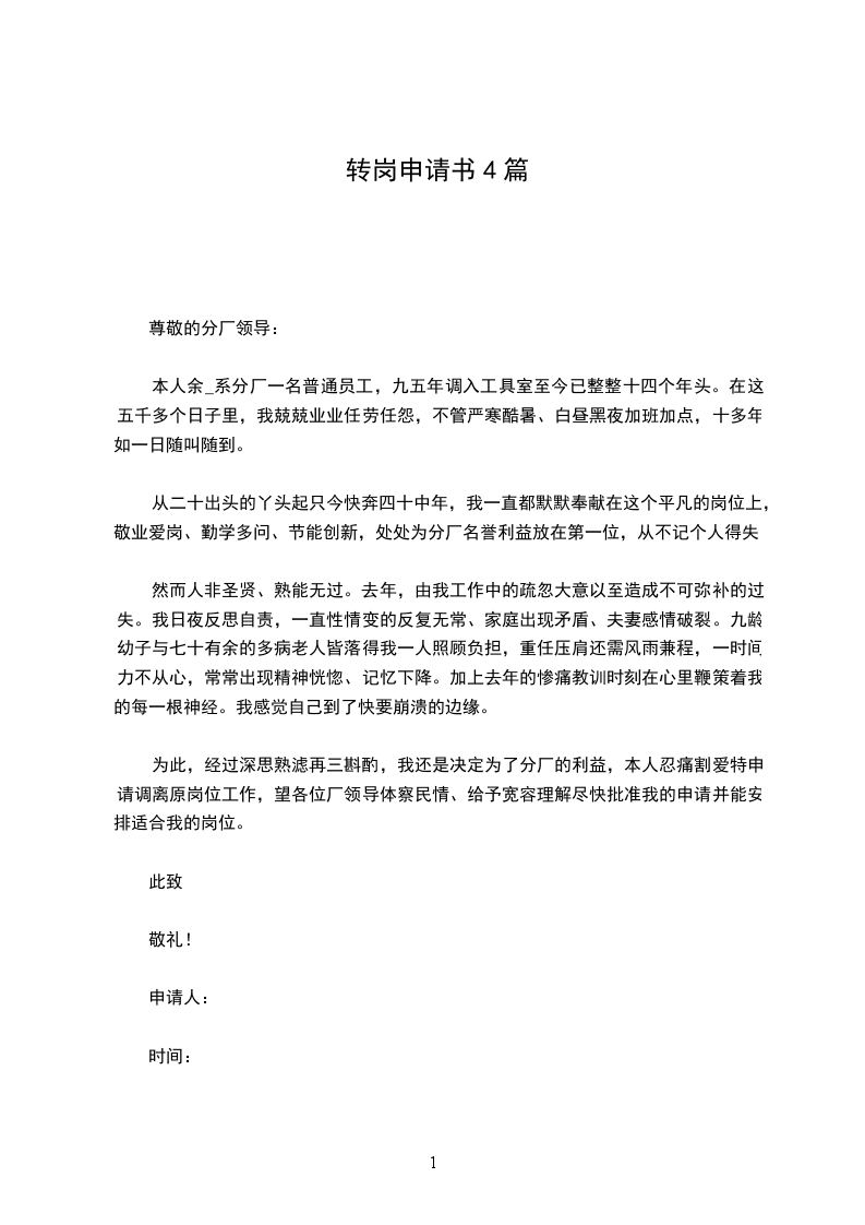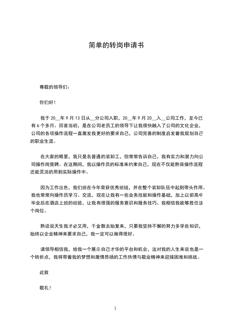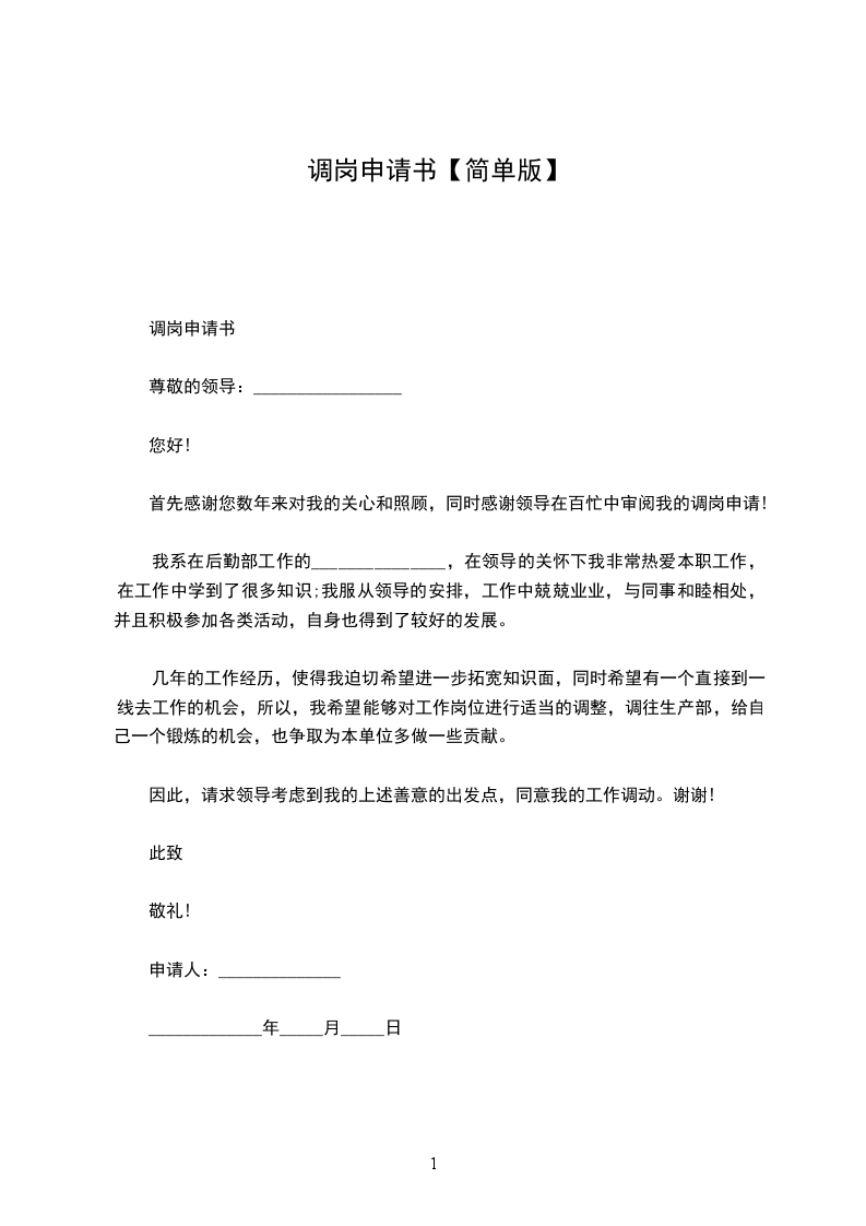 简单的转岗申请书