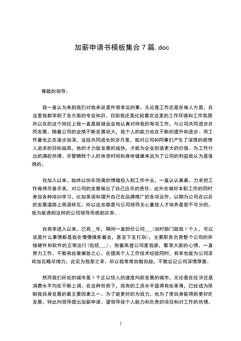 我相信,只要有付出,就会有收获,由于我目前的薪酬是___元,我认为已经不能和我目前的工作付出成正比。随着“____”战略体系建设的不断推进,我申请公司在充分考虑的情况下给我加薪,以资鼓励和肯定。就我目前的工作性质、工作表现、工作强度、工作要求而言,我期望能加到___元/月以上,望公司领导给予酌情考虑。