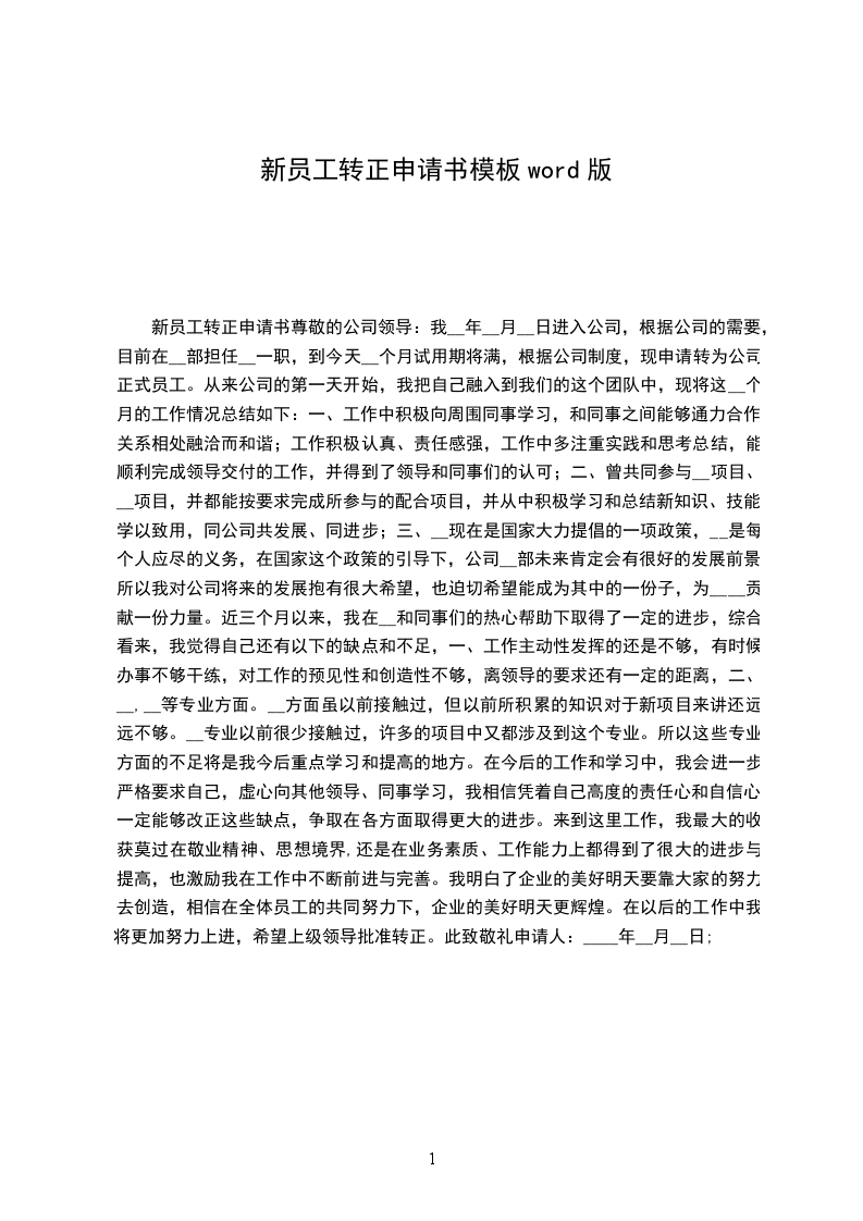 新员工转正申请书尊敬的公司领导:我__年__月__日进入公司,根据公司的需要,目前在__部担任__一职,到今天__个月试用期将满,根据公司制度,现申请转为公司正式员工。从来公司的第一天开始,我把自己融入到我们的这个团队中,现将这__个月的工作情况总结如下: