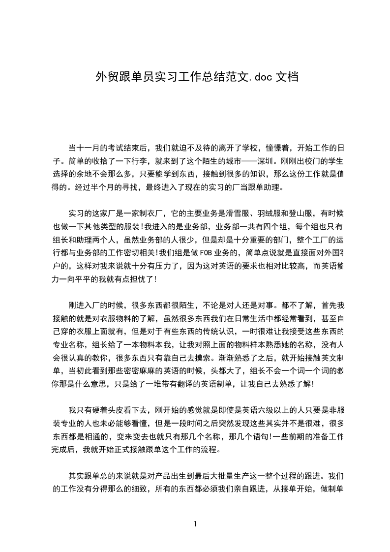 但是通过实习,加深了我对不同跟单工作、跟单知识的理解,丰富了我的实际管理知识,使我对跟单员工作有了一定认识,同时提升了将所学知识运用到实际中去的能力。跟单这个岗位是一份繁琐和辛苦的工作,工作量大,并且重复性工作多,对跟单人员的要求也很高,需要掌握产品知识、生产加工知识、单证知识、国际贸易实务,还需具备较强的综合分析能力、应变能力、协调能力、沟通能力,对英语的水平要求更高,不仅要会写,而且口语要过关,否则与客户的沟通就存在问题。所以我在实习期间也没有放松自己英语的学习。