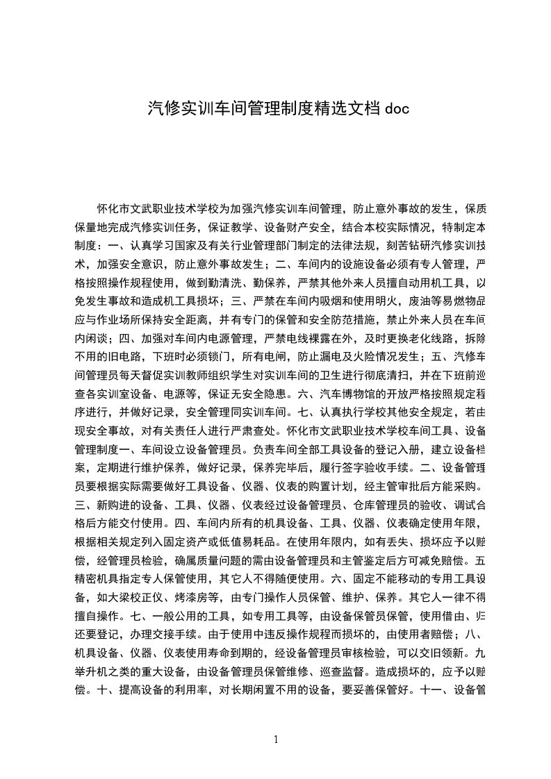 怀化市文武职业技术学校为加强汽修实训车间管理,防止意外事故的发生,保质保量地完成汽修实训任务,保证教学、设备财产安全,结合本校实际情况,特制定本制度: