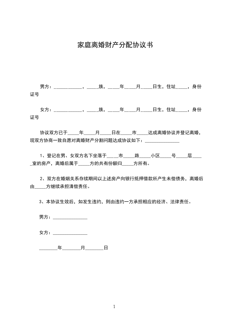 协议双方已于_____年_____月_____日在_____市_____达成离婚协议并登记离婚,现双方协商一致自愿对离婚财产分割问题达成协议如下:_______________