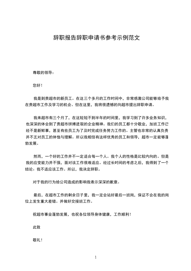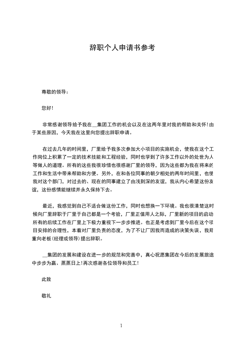辞职个人申请书参考20__年