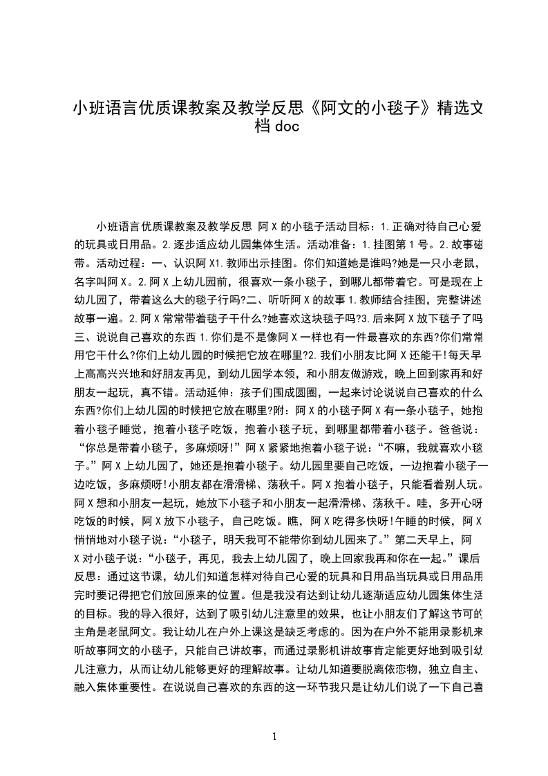 小班语言优质课教案及教学反思 阿X的小毯子活动目标: