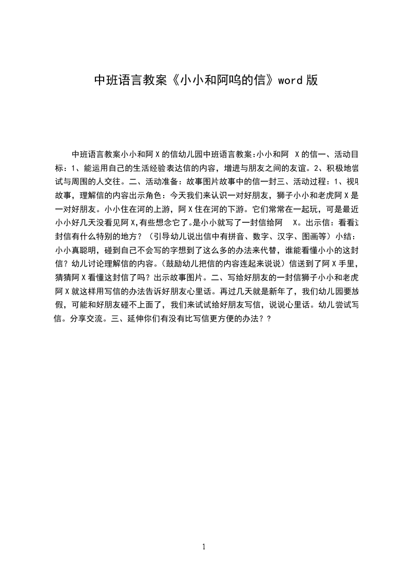 2.我们小朋友比阿X还能干!每天早上高高兴兴地和好朋友再见,到幼儿园学本领,和小朋友做游戏,晚上回到家再和好朋友一起玩,真不错。活动延伸:孩子们围成圆圈,一起来讨论说说自己喜欢的什么东西?你们上幼儿园的时候把它放在哪里?附:阿X的小毯子阿X有一条小毯子,她抱着小毯子睡觉,抱着小毯子吃饭,抱着小毯子玩,到哪里都带着小毯子。爸爸说:“你总是带着小毯子,多麻烦呀!”阿X紧紧地抱着小毯子说:“不嘛,我就喜欢小毯子。”阿X上幼儿园了,她还是抱着小毯子。幼儿园里要自己吃饭,一边抱着小毯子一边吃饭,多麻烦呀!小朋友都在滑滑梯、荡秋千。阿X抱着小毯子,只能看着别人玩。阿X想和小朋友一起玩,她放下小毯子和小朋友一起滑滑梯、荡秋千。哇,多开心呀!吃饭的时候,阿X放下小毯子,自己吃饭。瞧,阿X吃得多快呀!午睡的时候,阿X悄悄地对小毯子说:“小毯子,明天我可不能带你到幼儿园来了。”第二天早上,阿X对小毯子说:“小毯子,再见,我去上幼儿园了,晚上回家我再和你在一起。”课后反思:通过这节课,幼儿们知道怎样对待自己心爱的玩具和日用品当玩具或日用品用完时要记得把它们放回原来的位置。但是我没有达到让幼儿逐渐适应幼儿园集体生活的目标。我的导入很好,达到了吸引幼儿注意里的效果,也让小朋友们了解这节可的主角是老鼠阿文。我让幼儿在户外上课这是缺乏考虑的。因为在户外不能用录影机来听故事阿文的小毯子,只能自己讲故事,而通过录影机讲故事肯定能更好地到吸引幼儿注意力,从而让幼儿能够更好的理解故事。让幼儿知道要脱离依恋物,独立自主、融入集体重要性。在说说自己喜欢的东西的这一环节我只是让幼儿们说了一下自己喜欢的东西在他(她)上幼儿园的时候放在什么地方,没有问幼儿常常用它干什么,从而让我失去了一次了解幼儿平时生活、行为习惯的机会。我结尾是让玩具宝宝回家,这一环节可以培养幼儿动手的的能也可以考一下幼儿的记忆力。这就达到让幼儿既动手有动脑的效果。