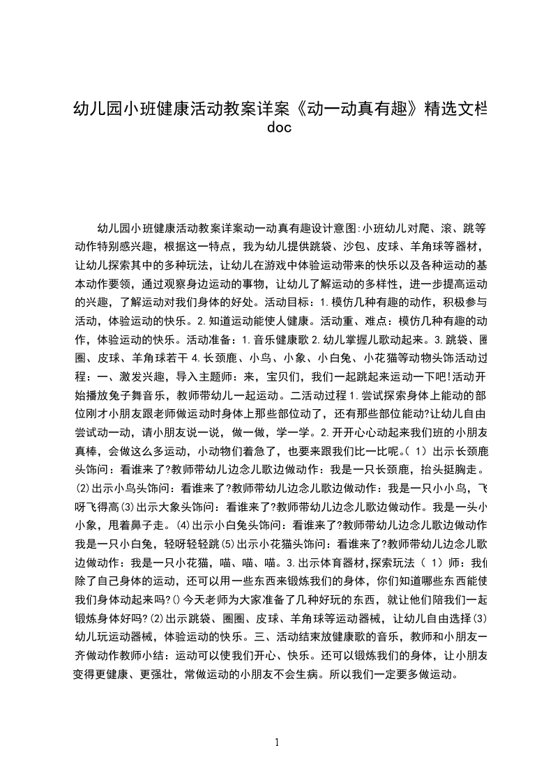 幼儿园小班健康活动教案详案动一动真有趣设计意图:小班幼儿对爬、滚、跳等动作特别感兴趣,根据这一特点,我为幼儿提供跳袋、沙包、皮球、羊角球等器材,让幼儿探索其中的多种玩法,让幼儿在游戏中体验运动带来的快乐以及各种运动的基本动作要领,通过观察身边运动的事物,让幼儿了解运动的多样性,进一步提高运动的兴趣,了解运动对我们身体的好处。活动目标: