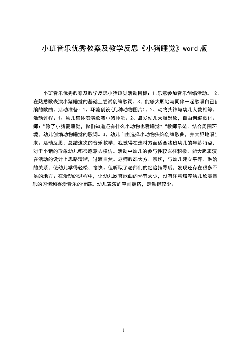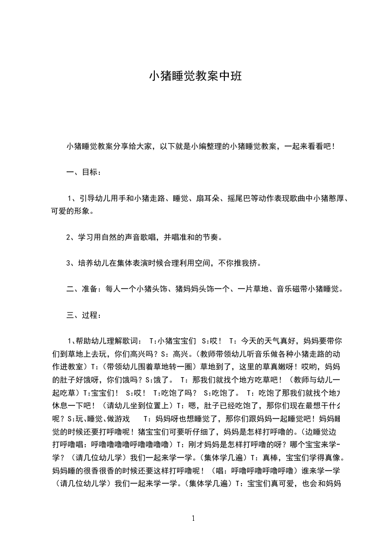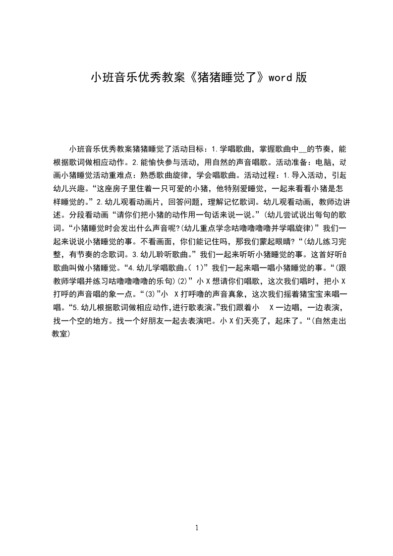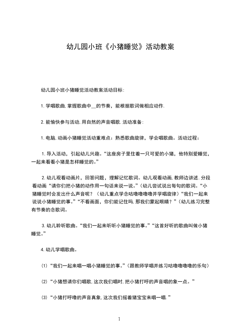 2.能愉快参与活动,用自然的声音唱歌。活动准备:电脑,动画小猪睡觉活动重难点:熟悉歌曲旋律,学会唱歌曲。