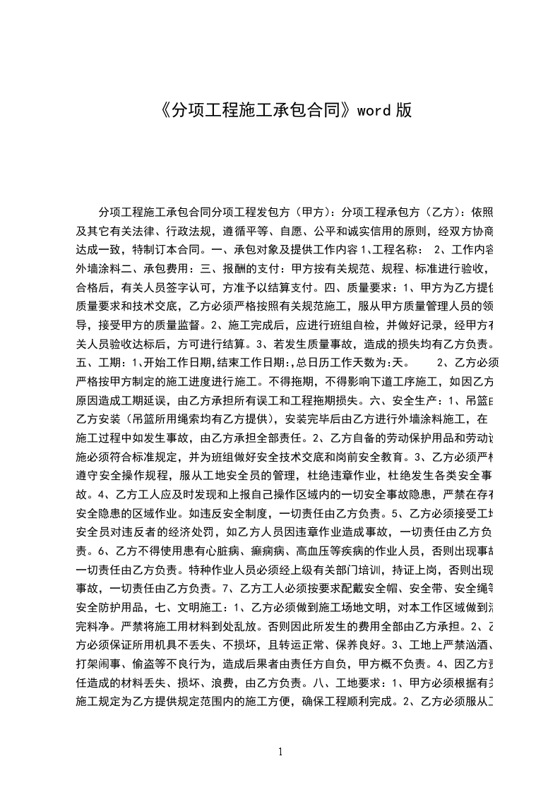 分项工程施工承包合同分项工程发包方(甲方):分项工程承包方(乙方):依照及其它有关法律、行政法规,遵循平等、自愿、公平和诚实信用的原则,经双方协商达成一致,特制订本合同。