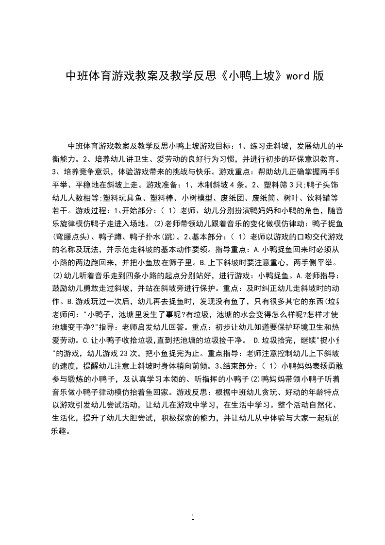 中班体育游戏教案及教学反思小鸭上坡游戏目标: