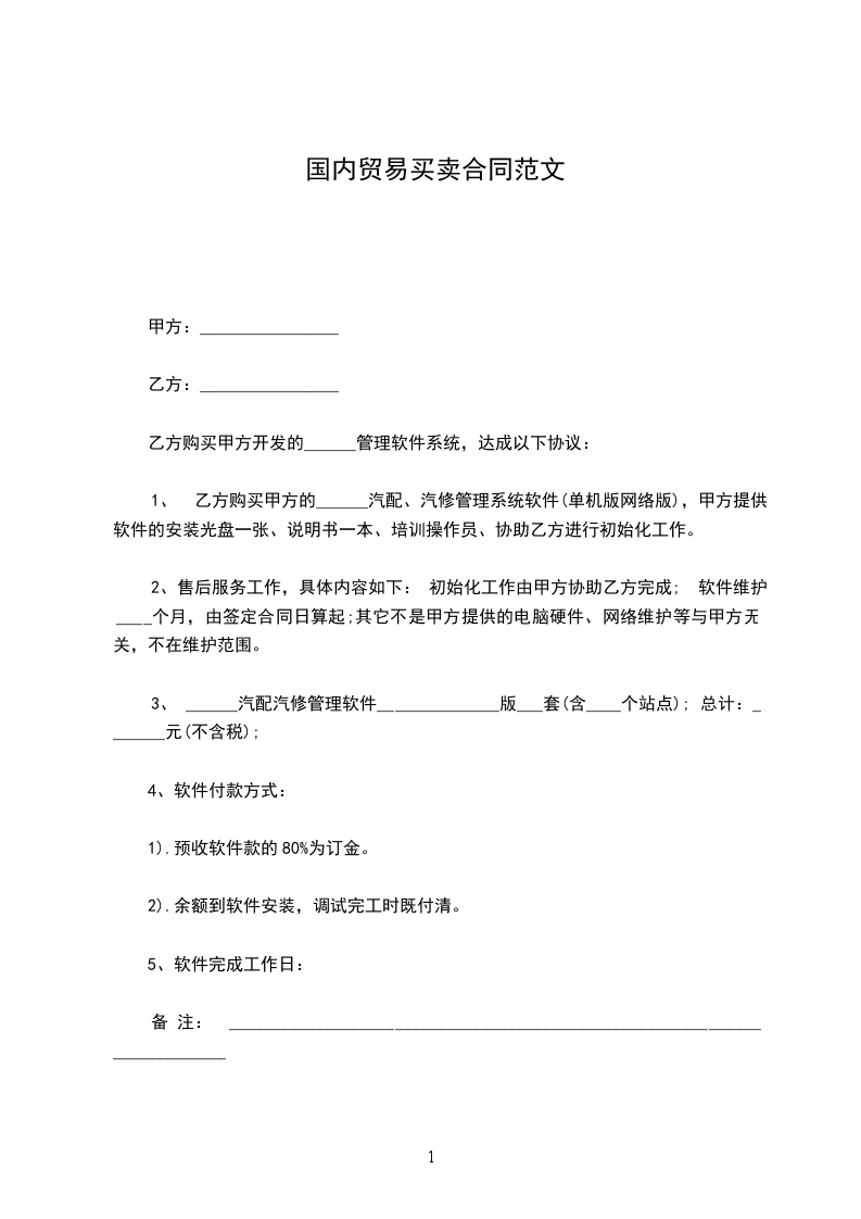 1、 乙方购买甲方的______汽配、汽修管理系统软件(单机版网络版),甲方提供软件的安装光盘一张、说明书一本、培训操作员、协助乙方进行初始化工作。
