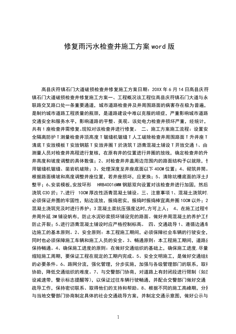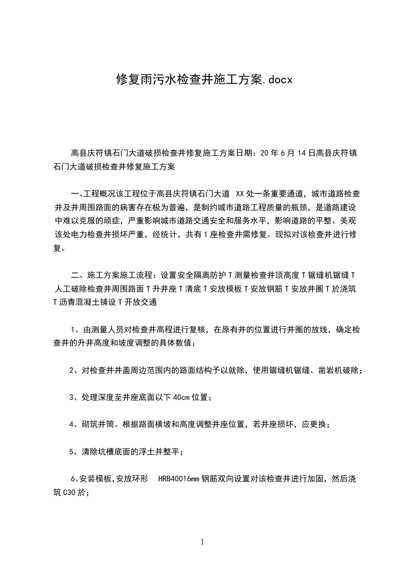 高县庆符镇石门大道破损检查井修复施工方案日期:20XX年6月14日高县庆符镇石门大道破损检查井修复施工方案