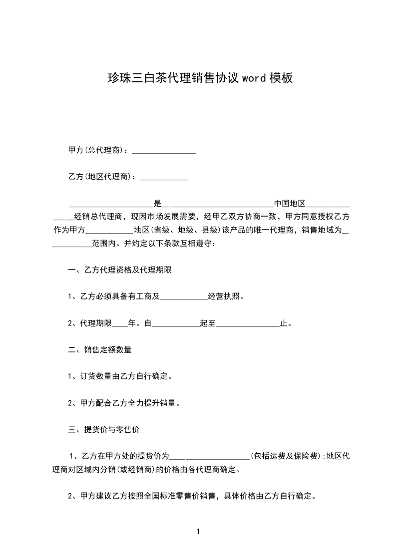 _____________________是____________________________中国地区________________经销总代理商,现因市场发展需要,经甲乙双方协商一致,甲方同意授权乙方作为甲方____________地区(省级、地级、县级)该产品的唯一代理商,销售地域为____________范围内。并约定以下条款互相遵守: