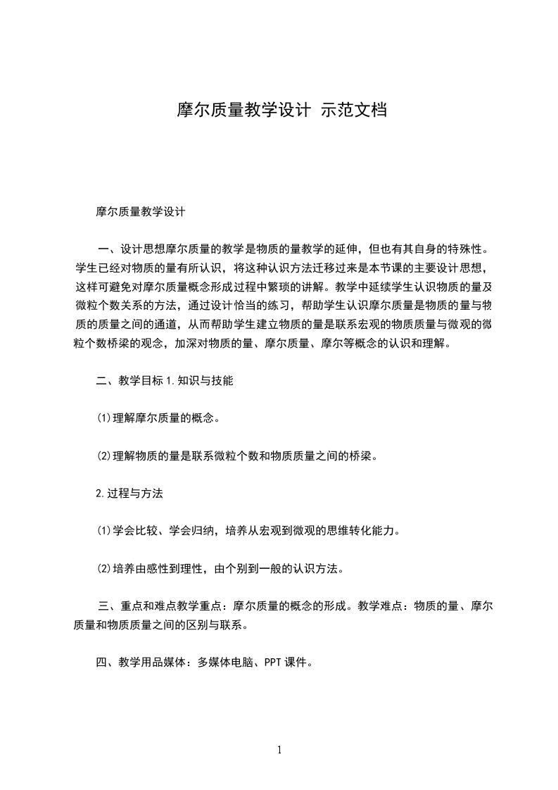 一、设计思想摩尔质量的教学是物质的量教学的延伸,但也有其自身的特殊性。学生已经对物质的量有所认识,将这种认识方法迁移过来是本节课的主要设计思想,这样可避免对摩尔质量概念形成过程中繁琐的讲解。教学中延续学生认识物质的量及微粒个数关系的方法,通过设计恰当的练习,帮助学生认识摩尔质量是物质的量与物质的质量之间的通道,从而帮助学生建立物质的量是联系宏观的物质质量与微观的微粒个数桥梁的观念,加深对物质的量、摩尔质量、摩尔等概念的认识和理解。