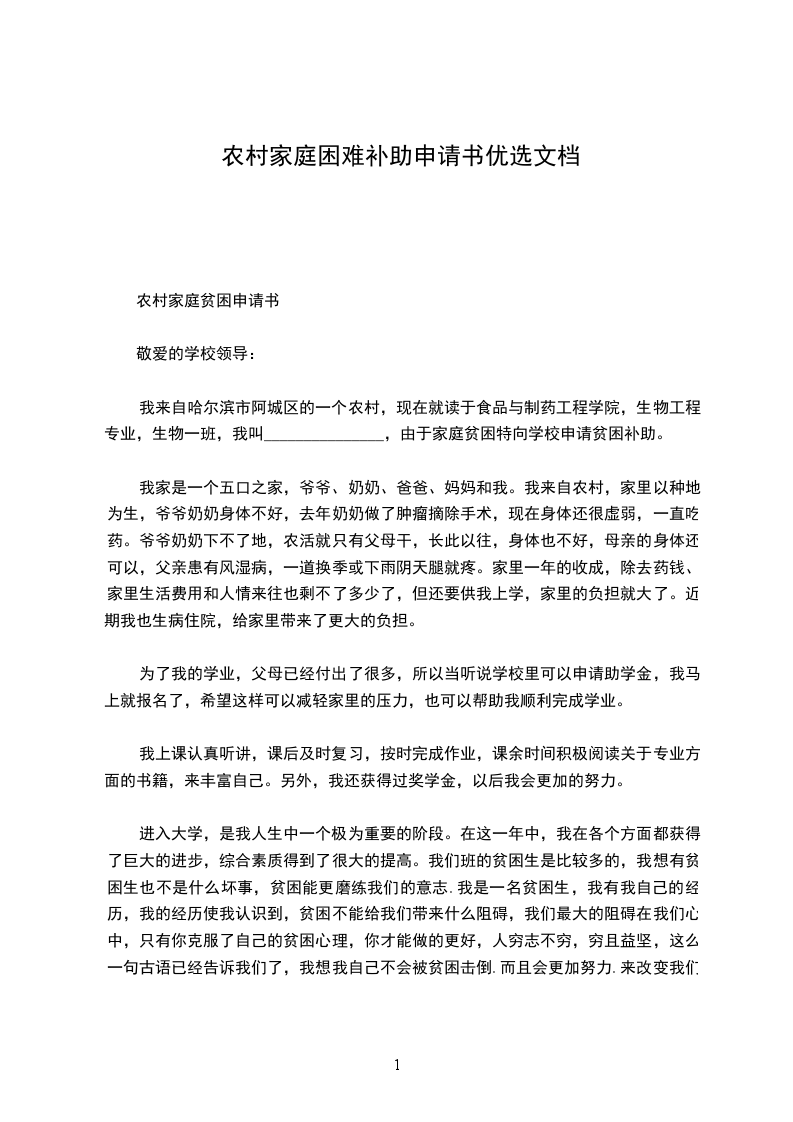 农村困难户补助申请书5