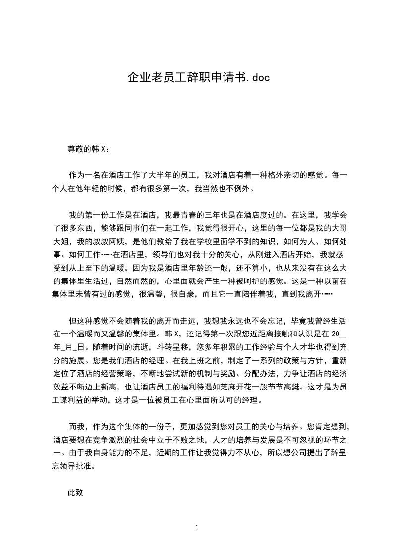 企业老员工辞职申请书3