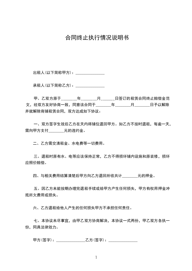 甲、乙双方原于________年________月_______日签订的租赁合同终止赔偿金范文,经双方友好协商一致,同意该合同于________年________月________日予以解除。并就解除商铺租赁合同,双方达成如下协议: