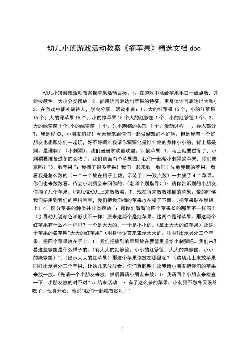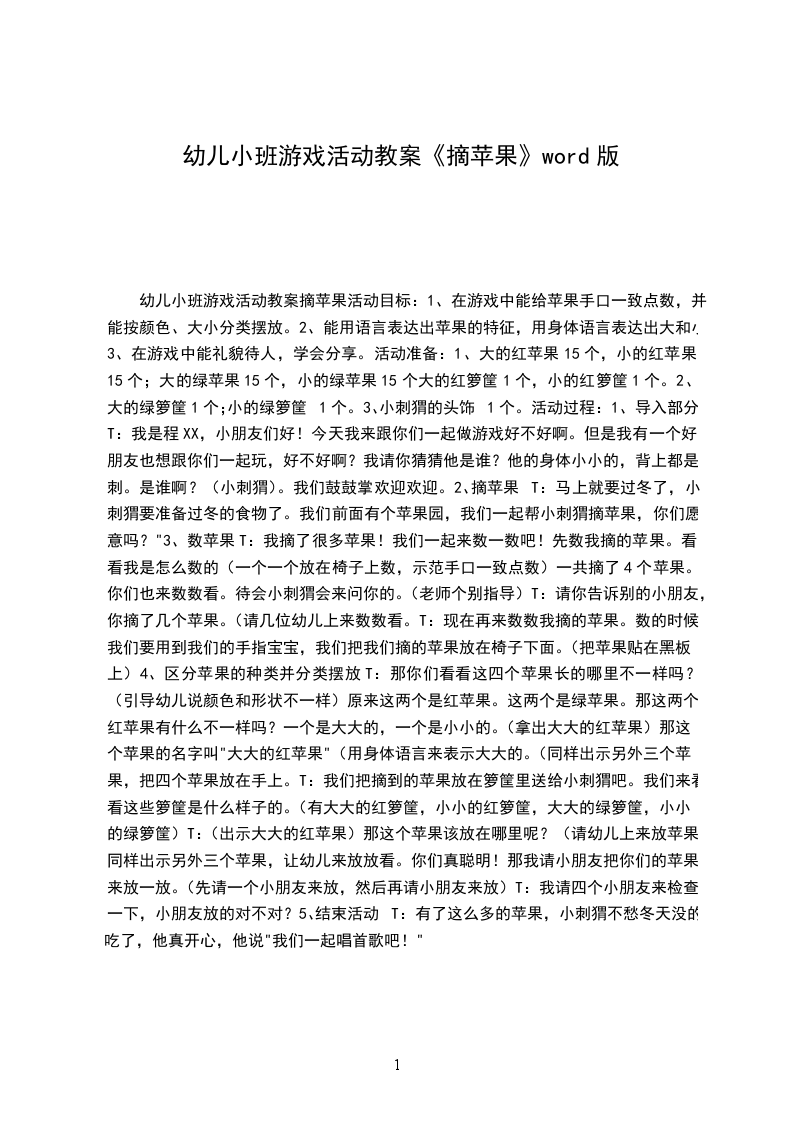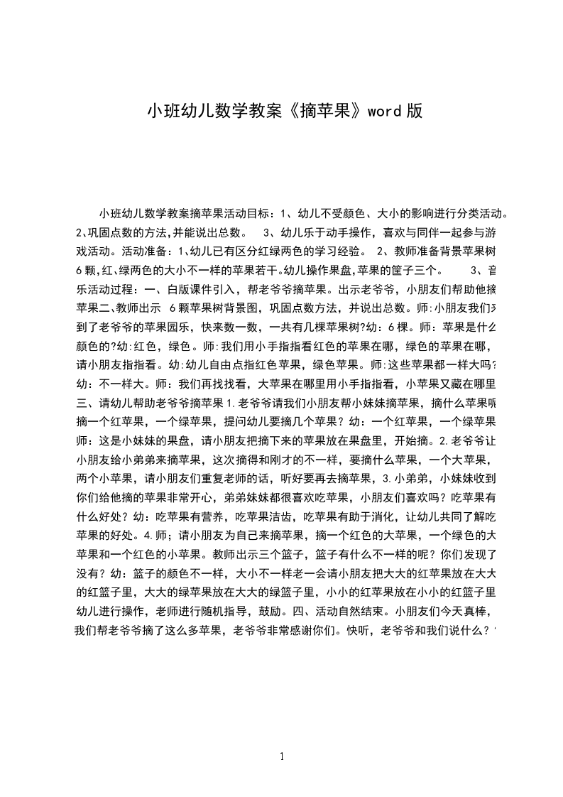 1.老爷爷请我们小朋友帮小妹妹摘苹果,摘什么苹果呢?摘一个红苹果,一个绿苹果,提问幼儿要摘几个苹果?幼:一个红苹果,一个绿苹果。师:这是小妹妹的果盘,请小朋友把摘下来的苹果放在果盘里,开始摘。
