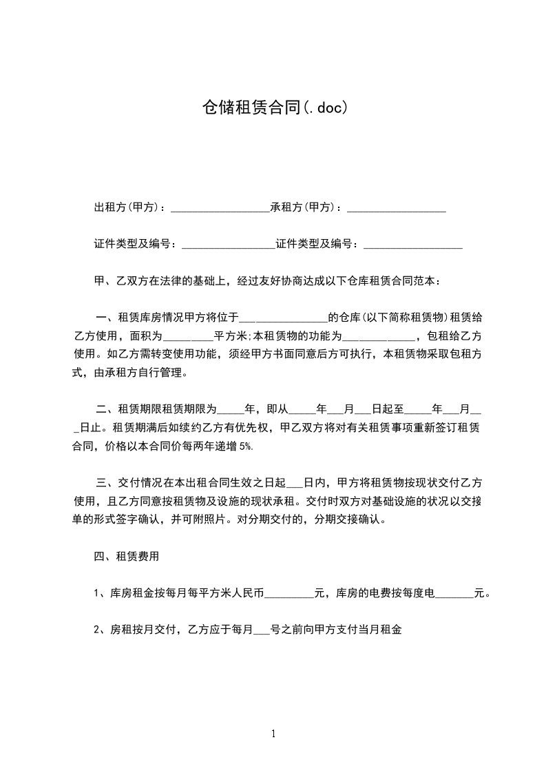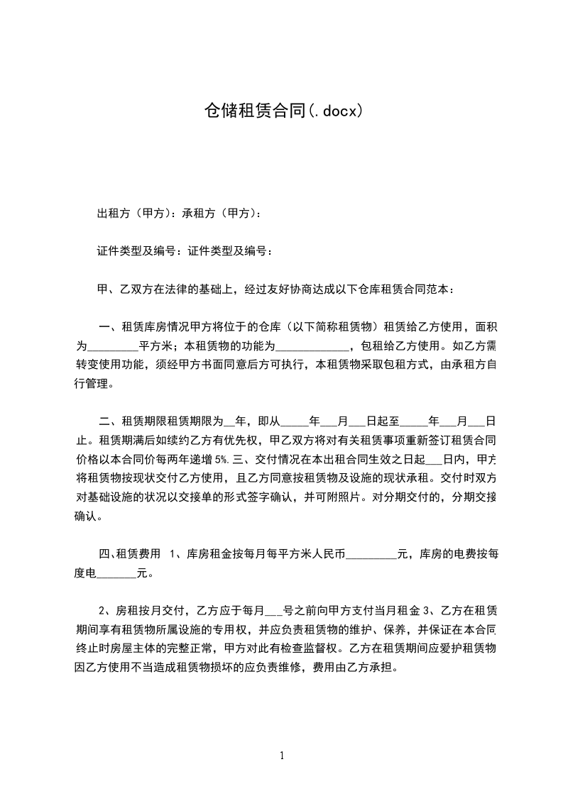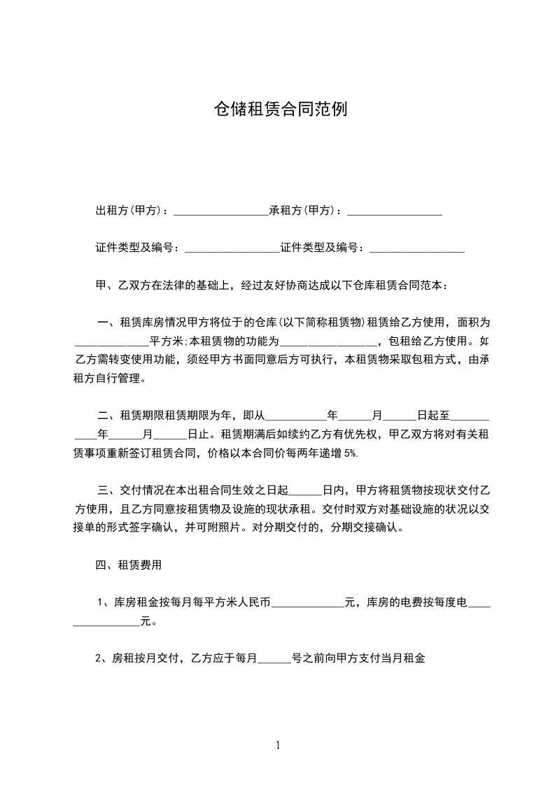一、租赁库房情况甲方将位于的仓库(以下简称租赁物)租赁给乙方使用,面积为_____________平方米;本租赁物的功能为_________________,包租给乙方使用。如乙方需转变使用功能,须经甲方书面同意后方可执行,本租赁物采取包租方式,由承租方自行管理。