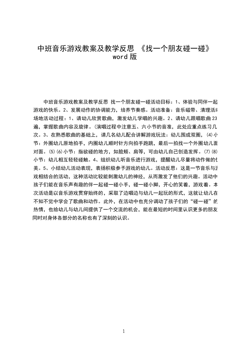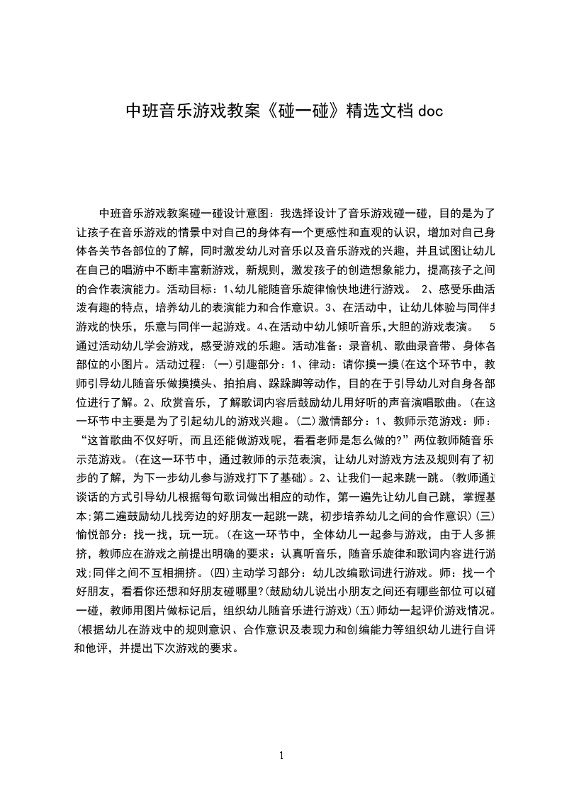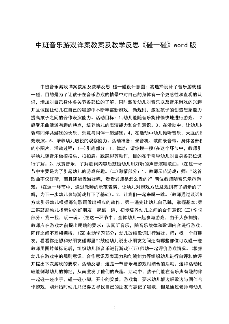 中班音乐游戏详案教案及教学反思 碰一碰设计意图:我选择设计了音乐游戏碰一碰,目的是为了让孩子在音乐游戏的情景中对自己的身体有一个更感性和直观的认识,增加对自己身体各关节各部位的了解,同时激发幼儿对音乐以及音乐游戏的兴趣,并且试图让幼儿在自己的唱游中不断丰富新游戏,新规则,激发孩子的创造想象能力,提高孩子之间的合作表演能力。活动目标: